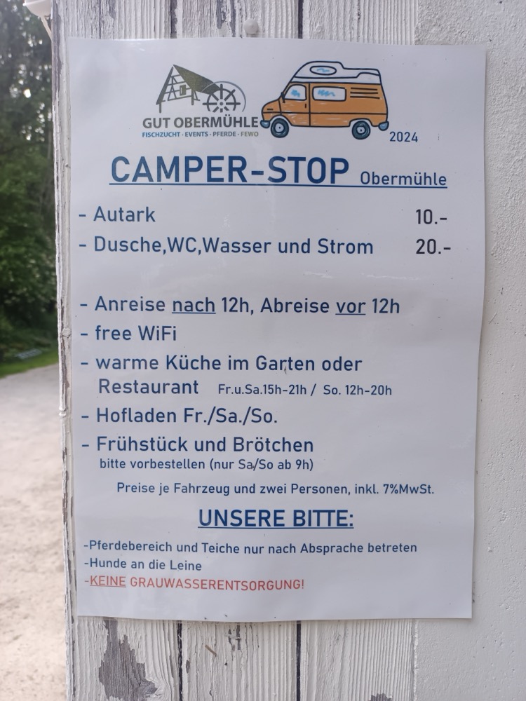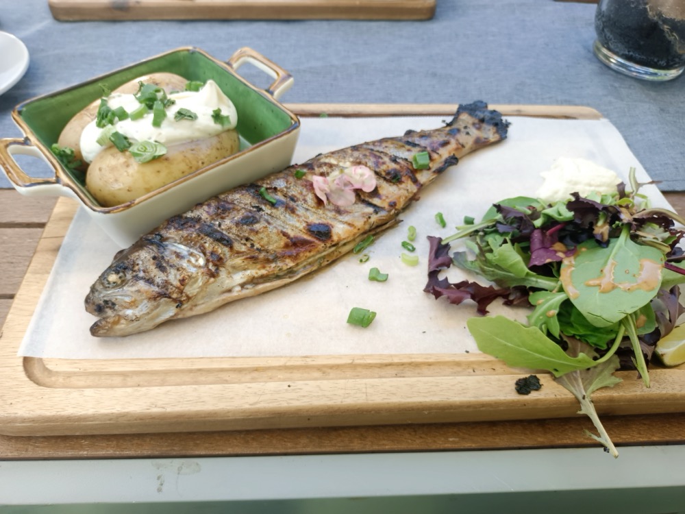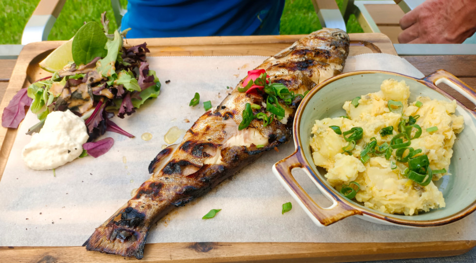 Podle webu je to zřejmě místo pro gastronomický zážitek, my ovšem sedíme na zahrádce. I tady je jistější mít rezervaci. Jsme zde naštěstí brzy, je volno. Rozsedíme s luxusním kvasnicovým pivkem, Bára s kafíčkem. No a mlsná na sebe nedá dlouho čekat, ale začal s tím tentokrát Aleš, není to na mně. Silně vyvinutá slabá vůle vítězí, vařit se nebude. Dáváme si pstruha. Excelentního. Dokonce i Bára sní všechno a to se málokdy vidí. Ryby si zde můžete také koupit a uvařit doma. Na webu najdete i recepty, jak na to. V areálu je možné za poplatek také parkovat auto, dodávku na noc. Ceník viz obrázek.