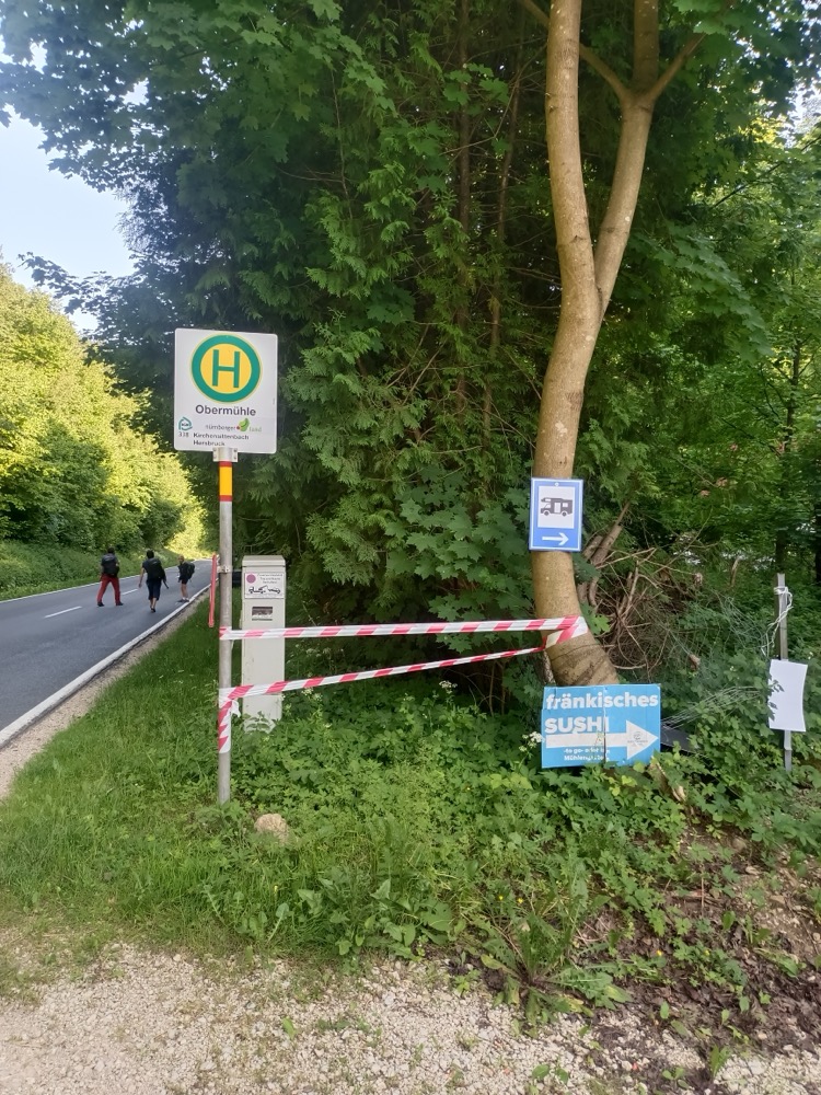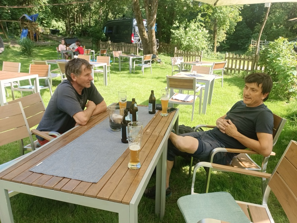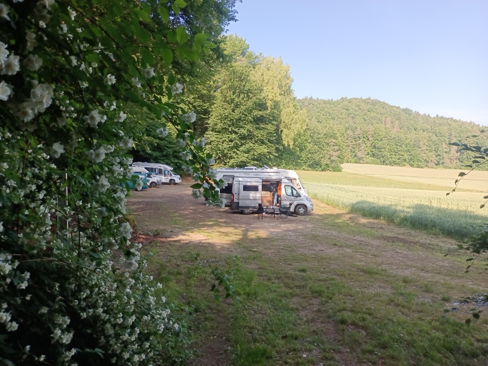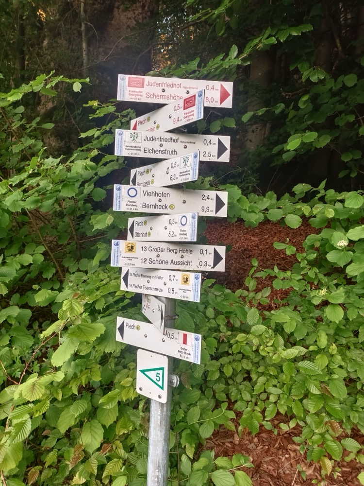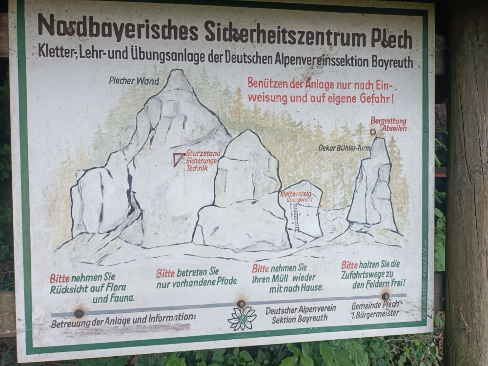 Lokalita je předem daná a scházíme se na plácku poblíž městečka jménem Plech. Tentokrát se orientuji v průvodci Frankenjura 2. Aleš nám básní o nádherné stěně, dlouhé cesty, cca do 14. hodin stín a my vůbec nevíme, co by mohl myslet. Už když se blížíme, je nám jasné, že jsme tady již několikrát byli. Jsme v oddíle F 6, Algersdorf Wand. Parkuje se pohodlně podél silnice. Vlevo cca 5 minut skály, vpravo cca 1 minuta hospoda.
