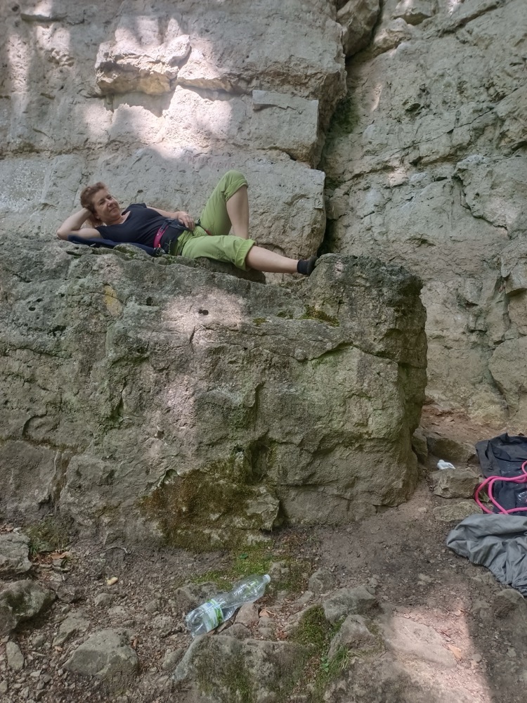 Protože je pátek, jsme ve skalách jen my. Tady si zadovádí všichni. Alda si na rozlez tahá 17. (6-) a já se v ní později pěkně pověsím a připadám si jako lezec. V levé části stěny se křižuje skupina lehčích cest, které, pokud mi je někdo nacvaká, také postupně udolám. Bára vyleze všechno na co se podívá, aniž by hekla. Na Otu je evidentně teplo. Nicméně vydržíme tady až do pozdního odpoledne a plynule se přesuneme do hospody.
