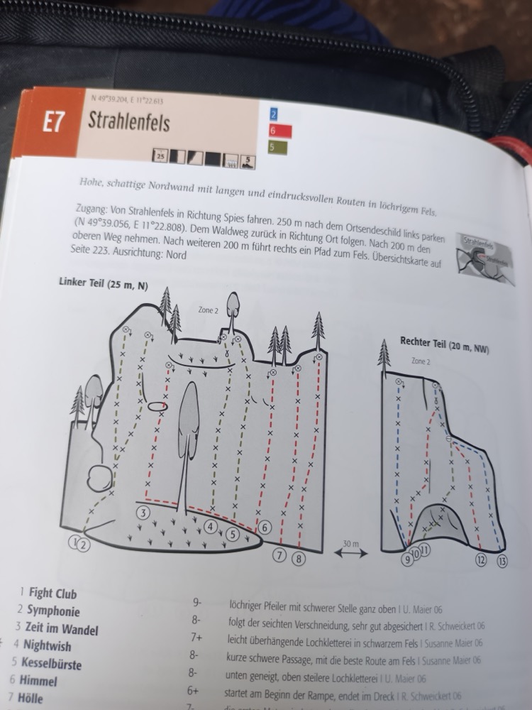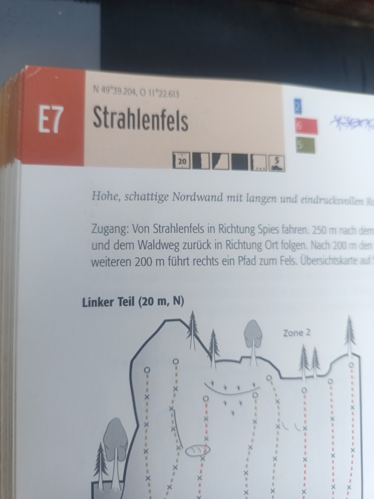 Strahlenfels je severní stěna. Parkování je u silnice před odbočkou ke skalám v takovém trojúhelníku. Míst není moc. Ke skále je cesta pohodlná cca 5 minut. Nevýhodou oblasti je položená spodní třetina, která končí policí. A k té polici je obvykle mokrá. Vlastně si lezení tady z dřívějška moc nepamatuji, protože jsme pokaždé přišli, viděli mokré mechy, proteklé chyty a šli jsme pryč. Tentokrát byly mechy vysušené, ale stejný nápad mělo cca 5 dalších dvojek. Ota a já jsme začali vpravo u jeskyňky a Aleš s Bárou se rozložili pod těžšími cestami. Spodní části těžkých cest jsem si přelezla za nimi a 7 s pauzami až nahoru. S ostatními lezci jsme se celkem plynule prostřídali. Nějak mně to tam bavilo. Možná jsem už trochu posílila, co mi vlastně také zbývá, s touhle partou.