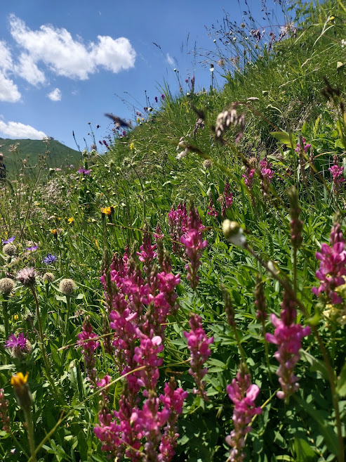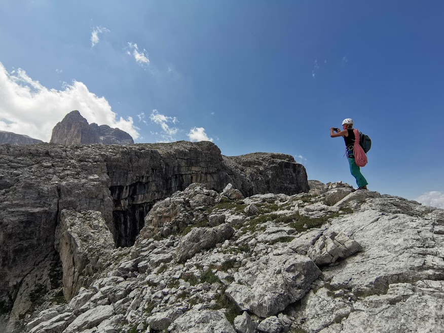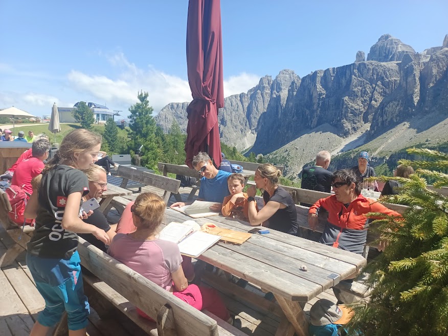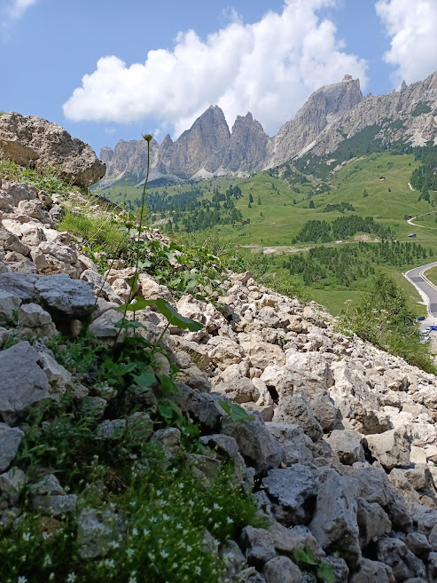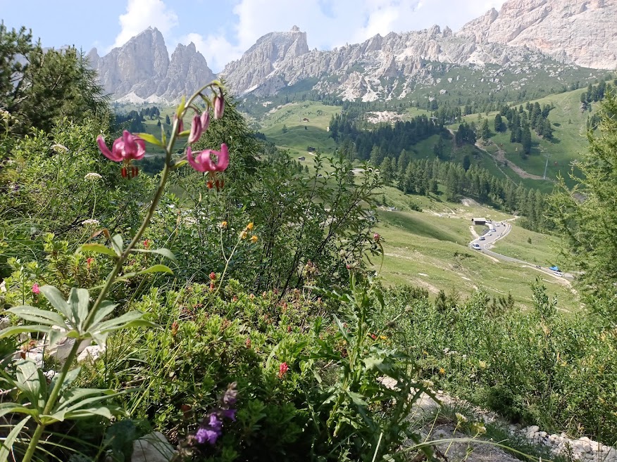 Poblíž tohoto památníku je začátek přístupové cesty k ferratě Cesare Piazzeta. Pokud nejste tak velká skupina, jako byla ta naše, je možné podél této cesty také zaparkovat, možná i přespat. Ještě se nám nechtělo sedlo opouštět, blížilo se poledne a když je ten volný den, dáme pizzu. Příjemně nás překvapila restaurace hotelu Savoia svými cenami. Měrkou cen v restauraci pro nás bývá pizza Margarita a tady stála stejně jako třeba v Arcu. S plnými bříšky jsme se táhli po turistické značce do protilehlého kopce. Protože se zde v zimě všude lyžuje, na každé vyvýšenině je konec nějaké lanovky a horská chata. Vyšli jsme až na nejvyšší kopec Col dei rossi. Nemohli jsme se odtrhnout od výhledů do okolí. Viděli jsme ledovec na Marmoladě, jezero Lac de Fedaia a celé horské masivy Dolomit. Fotili jsme se všude, nacházeli jsme další a další druhy rostlin. Krásnou italskou atmosféru jsme doladili kávou a drinkem.