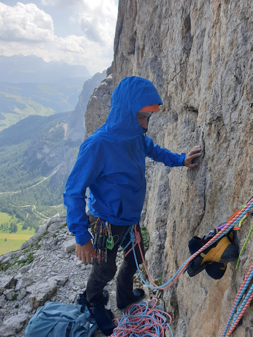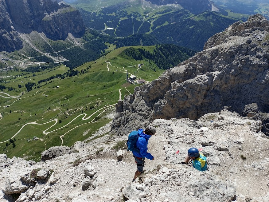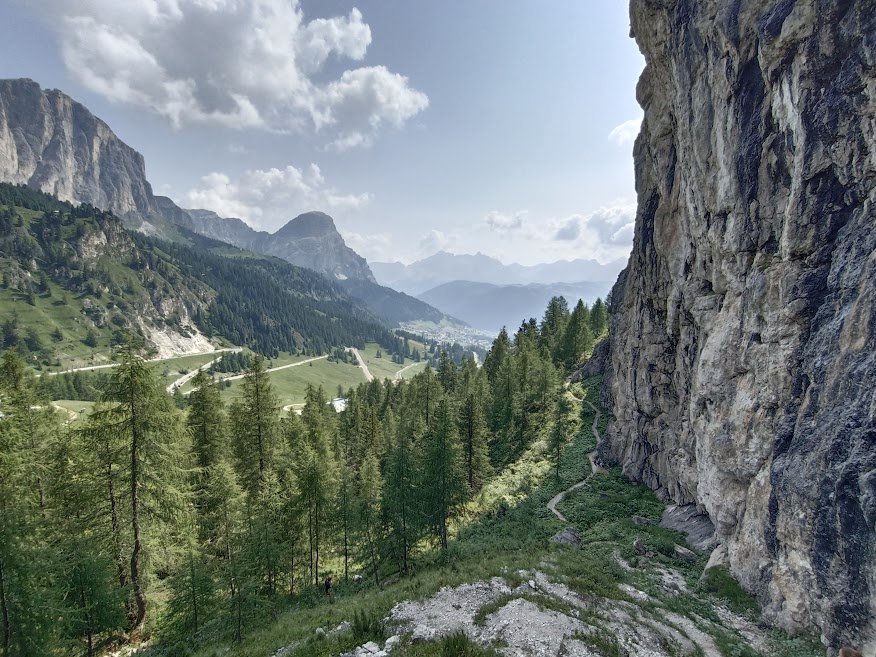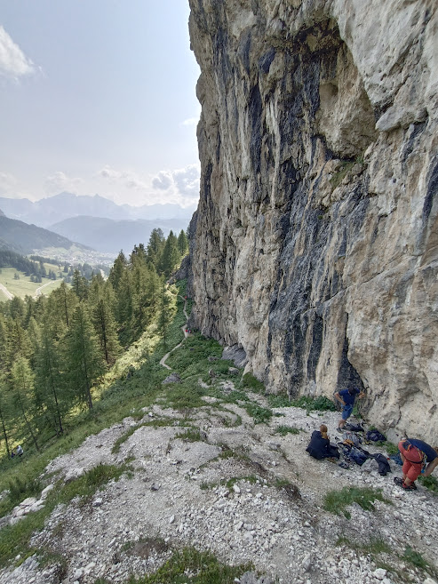 Z parkoviště je nástup na Via Ferrata Brigata Tridentina Pisciadu. Je obtížnosti C a nástup je poměrně blízko od parkoviště. Bývá tedy za hezkého počasí hodně vyhledávaná. Naše skupina ji vyšla již vloni, tudíž naše ferratové cíle byly jinde. Cíle skupiny byly momentálně lezecké. Ota s Patrikem mají nakoukanou vícedélkovou cestu přímo nad námi, ale vzhledem k deštivé předpovědi nezbývá jen doufat, že se počasí umoudří.