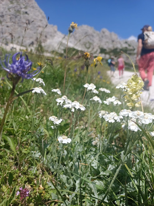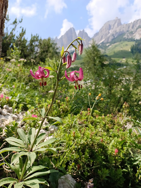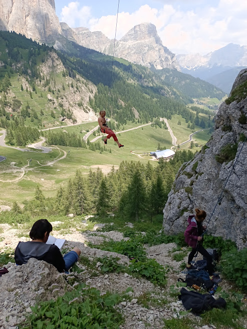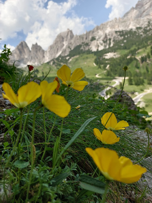 Jak jsem již říkala, nádherné výhledy a pokud jste milovníkem horské flóry, budete úplně bez sebe. Ale to už přes nás zase přejde pořádná bouřka, začínáme uvažovat o přesunu. Všichni doufají, že další lezecká oblast Laste, která je stolovou horou v nižší nadmořské výšce a nemá nad sebou tak velkou masu horniny, nebude proteklá. Je v průvodci umístěná pod oblasti poblíž Cortina dAmpezzo. Přesun není kilometrově nikterak daleko, ale cesta se klikatí nahoru a dolu přes horská sedla. Je se ovšem na co koukat. Nakupujeme dobrůtky a nápoje, parkoviště, kde hodláme pobýt je v lese kde široko daleko nic není. Výhodou je ale pramen s pitnou vodou v dochozí vzdálenosti a úplný klid.