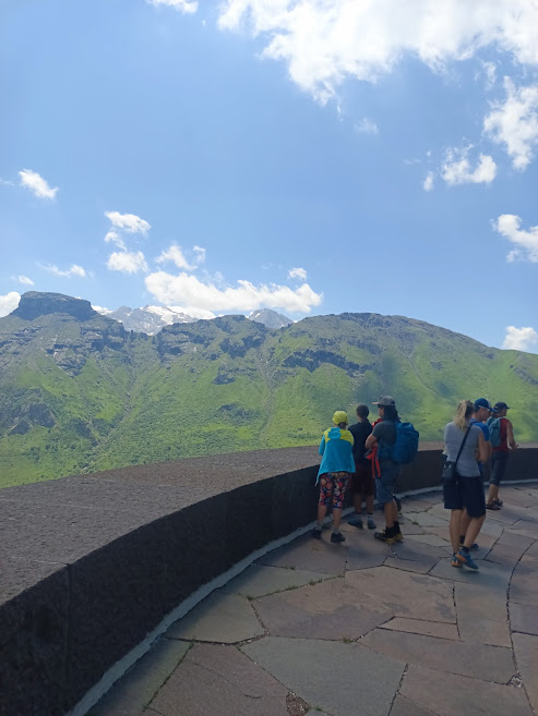 V neděli byl restday a naplánovali jsme přesun na naše původní parkoviště spojený s výletem do Passo Pordoi v nadmořské výšce 2239 m n.m. V okolí tohoto horského sedla je několik význačných ferrat. Nejblíže sedla je Via Ferrata Cesare Piazzeta. Vzhledem ke složení naší skupiny a obtížnosti ferraty D jsme zvolili turistické cíle. Pohodlnou kočárovou cestou jsme navštívili Německý vojenský hřbitov Pordoi Pass. (Zařízení bylo přímým důsledkem Dohody o válečných hřbitovech uzavřené mezi Německou říší a Italským královstvím v roce 1937. Stavba pomníku byla zahájena v roce 1937. Když však v roce 1939 vypukla druhá světová válka , práce se stále nepracovaly. dokončeny, a proto byly zastaveny. Práce byly obnoveny v roce 1956 a pomník byl nakonec slavnostně otevřen 19. září 1959. V kryptě odpočívá 8 582 rakouských a německých mrtvých z první světové války zdroj Wikipedie).