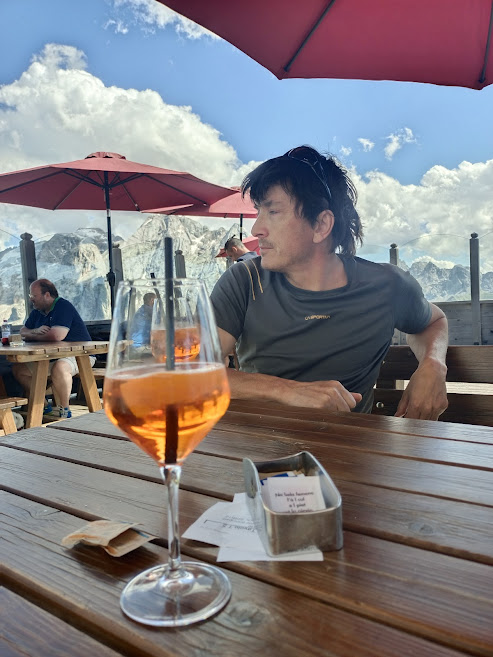 Vše proběhne báječně a jakmile se dostaneme z výšin na trávu, první cestičkou běžíme do hospody na Aperol spriz, pivko a limonádu uzavřít skvělý zážitek. Ještě že terasa se stolky byla směrována do údolí a my neviděli, že se valí další dešťová vlna. V klidu jsme dopili a pak to teprve viděli. Na parkoviště jsme měli cca 2 kilometry po stezičce loukama. Takhle rychle jsme nikdy neběželi. Za námi se natahovaly mraky jako chapadla. Doběhli jsme v začínající bouři i s kroupami. Vítr lomcoval auty a nedovřené světlíky obytňáků lítaly po parkovišti. Jak přišla, tak odešla a zbyl po ní jen potok valící se z horského srázu pro obveselení dětí.