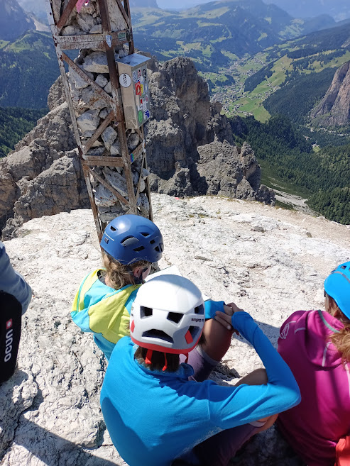 Další den je v podobném duchu, akorát si všichni moji siláci začínají libovat, jak jsou ty stisky parádní, jako jsou ty cesty, které mají až 40 metrů krásně dlouhé a jak je ve stínu dobře. Po obědě vyrážíme na vršek hory, ferratu vyšli i naši sedmiletí borci. Bylo fajn nechat děti opět si připomenout, jak se pracuje s ferratovým vybavením. Absolvovali jsme kramle, můstky i lezení po drátě.