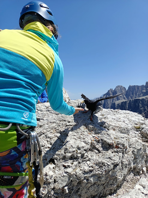 Je neuvěřitelné, jak rychle se vápencová hornina dokáže vysušit. Raději zkoumáme radar. Předpověď na pár hodin dobrá a nic nás tedy neodradí od výstupu. Cesta se hledá dobře, i když jdeme sami. Ostatní turisté cestu zřejmě vzdali. Cestička vede opět botanickou zahradou, plíží se za námi cáry odpařené mlhy. Celé je to krásné a proměnlivé. Vystupujeme kamenným kuloárem a již vidíme první ocelová lana. Nandáváme ferratové vybavení, helmy a začínáme stoupat. Je to jednoduchý bezpečný výstup, ale je po dešti, trochu mokro a máme s sebou i menší děti, dbáme tedy na bezpečnost. Děti jsme si rozdělili mezi dospělé a neustále je upozorňujeme, že i když mají za sebou daleko těžší cesty, je potřeba se soustředit. Zajištěné úseky jsou asi jen dva, jinak se relativně bezpečná pěšina vine skalisky nahoru na horu. Vidíme celé údolí hluboko pod sebou, cesty jako stuhy a nádherný pohled na protilehlý masiv Cima Piscadú s téměř třítisícovými vrcholy, který odsud vypadá jako poschoďový dort. Čeká na nás vrcholový kříž, knížka a krmení krkavců z ruky. Fouká, je jiskřivý vzduch a ti jedinci, kteří cestou remcali, jsou uneseni okolní krajinou. Fotíme se a vzhledem k počasí, rychle dolů. Sestup je obvykle horší než cesta nahoru.
