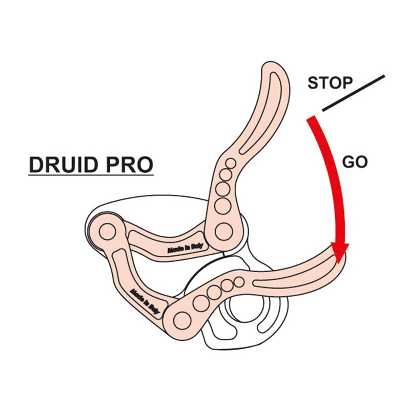 Brzda je určena pro statická lana o průměru 9,9 – 11 mm. Druid PRO je navržen výhradně pro zkušené uživatele, záměrně není vybaven funkcí „anti-panic“!