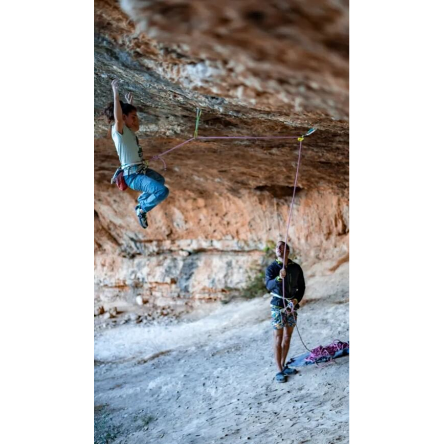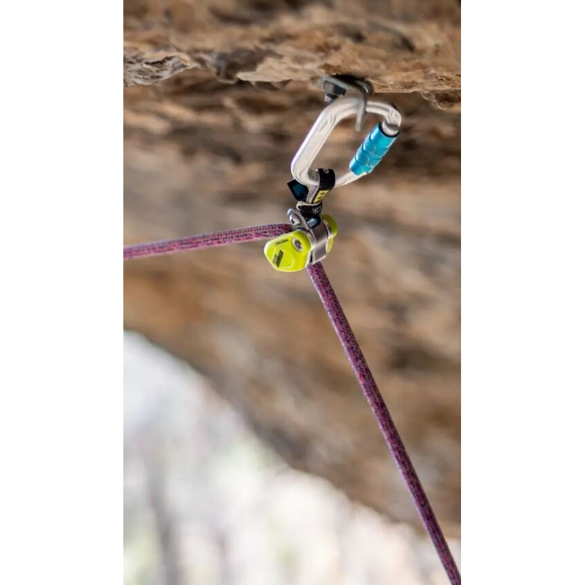 Integrovaná kladka minimalizuje tření při průchodu lana přes první jištění, takže při lezení ani cvakání expresky téměř nepoznáš, že je Ohmega zapojená do systému. To oceníš zejména na delších a náročnějších cestách.