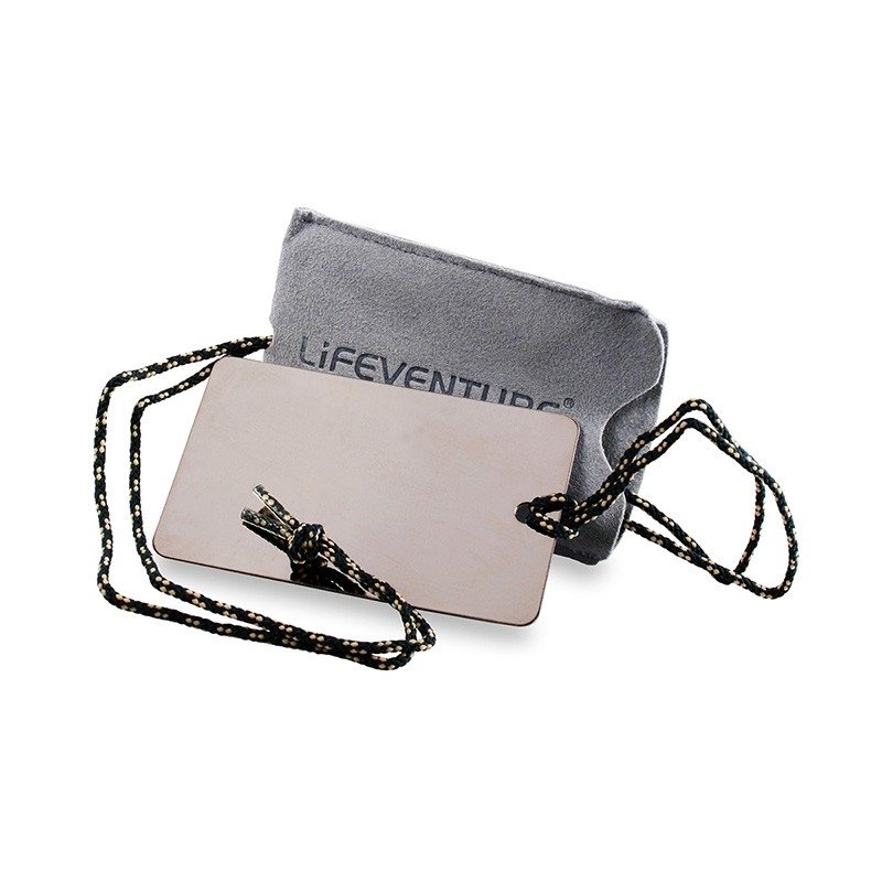 Cestovní zrcátko z odolné nerezové oceli a šňůrkou na krk. Zrcátko je uložené v semišovém pouzdru, které slouží zároveň k samotnému čištění.