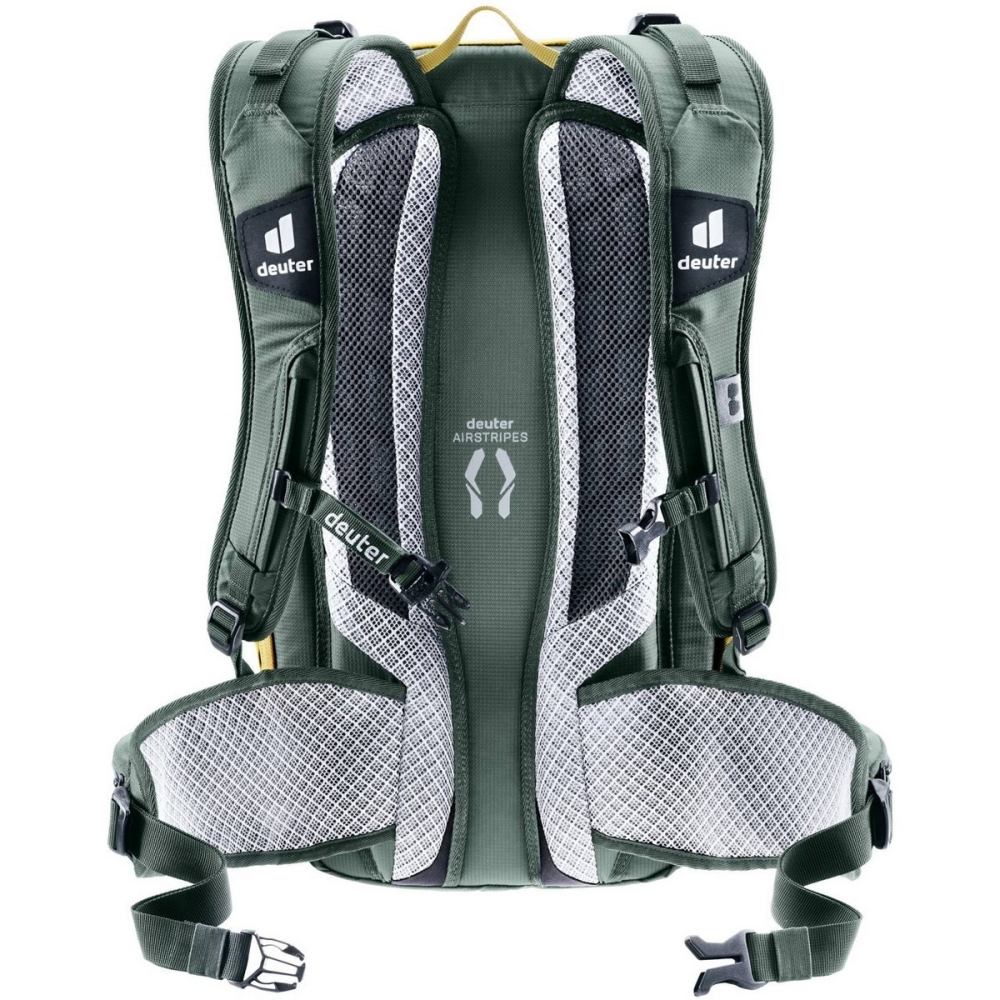 S důrazem na to podstatné! Nový Flyt má stále všechny funkce, které potřebujete pro velký den na horském kole: klipy pro připevnění poloplášťové přilby, boční kompresní popruhy pro připevnění celoobličejové helmy a dva skládací řemeny pro připevnění chráničů na vnější stranu batohu. Samozřejmostí je chránič zad certifikovaný TÜV / GS, který lze snadno sundat a poskytuje maximální bezpečnost, když se něco pokazí. Deuter Airstripes zádový systém poskytuje vynikající ventilaci přes záda.