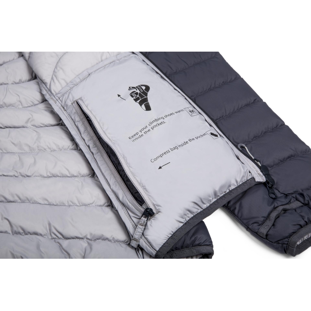 Vysoká hustota tkaní ručí za odolnost látky a zachovává si prodyšnost Vysoký loft peří min 650 cuin+. Úprava DWR (Durable Water Repellent) brání proniknutí vlhkosti mezi peří.