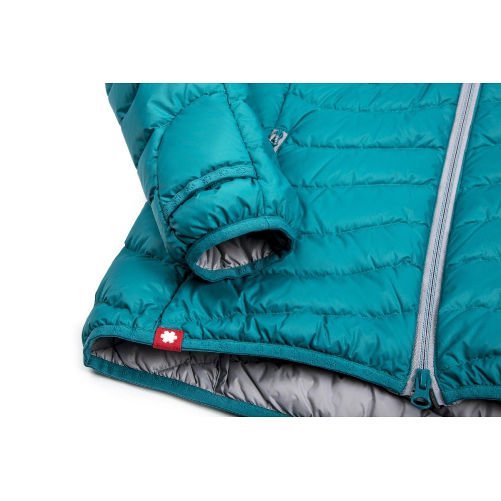 Vysoká hustota tkaní ručí za odolnost látky a zachovává si prodyšnost Vysoký loft peří min 650 cuin+. Úprava DWR (Durable Water Repellent) brání proniknutí vlhkosti mezi peří.