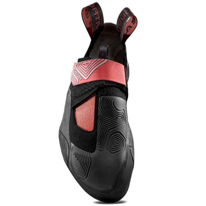 Podešev Vibram® XS-Grip2 s odlišnou tloušťkou ve špičce podporuje preciznost držení, zatímco pata s nižším objemem umožňuje maximální přesnost při patování. Gumová obsázka pokrývá 90 % přední plochy svršku, aby upřednostňovala zahakování na špičce při zachování přizpůsobivosti pro různé typy tvarů chodidel.