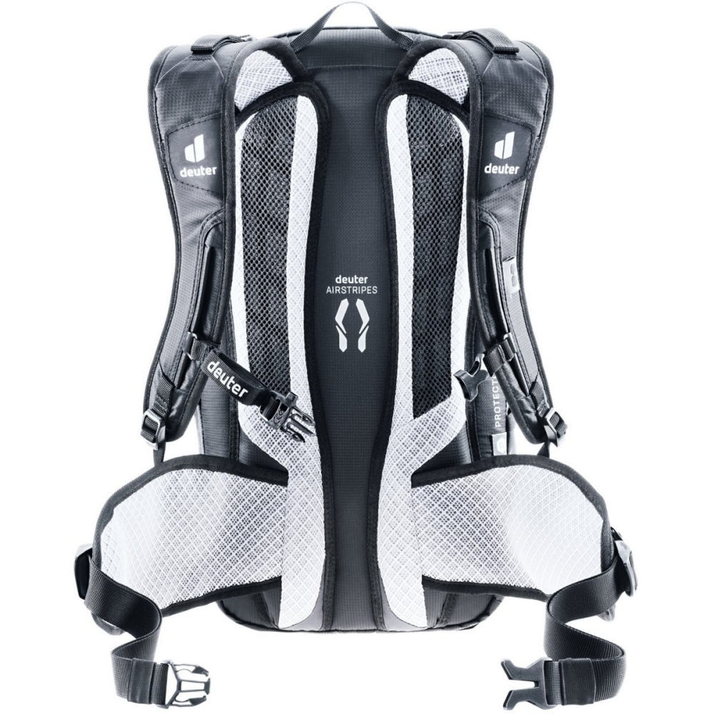 S důrazem na to podstatné! Nový Flyt má stále všechny funkce, které potřebujete pro velký den na horském kole: klipy pro připevnění poloplášťové přilby, boční kompresní popruhy pro připevnění celoobličejové helmy a dva skládací řemeny pro připevnění chráničů na vnější stranu batohu. Samozřejmostí je chránič zad certifikovaný TÜV / GS, který lze snadno sundat a poskytuje maximální bezpečnost, když se něco pokazí. Deuter Airstripes zádový systém poskytuje vynikající ventilaci přes záda.