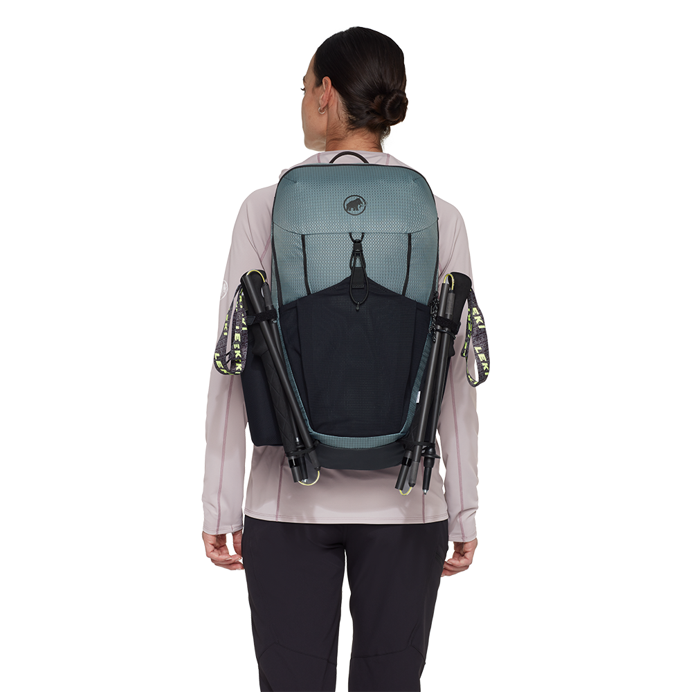 Díky kratší délce zad, ergonomicky tvarovaným ramenním popruhům a přizpůsobenému bedernímu pásu poskytuje maximální pohodlí při nošení. Ducan 22 Women od švýcarské značky Mammut se vyznačuje nízkou hmotností a chytrým úložným prostorem, který je snadno dostupný i během chůze.