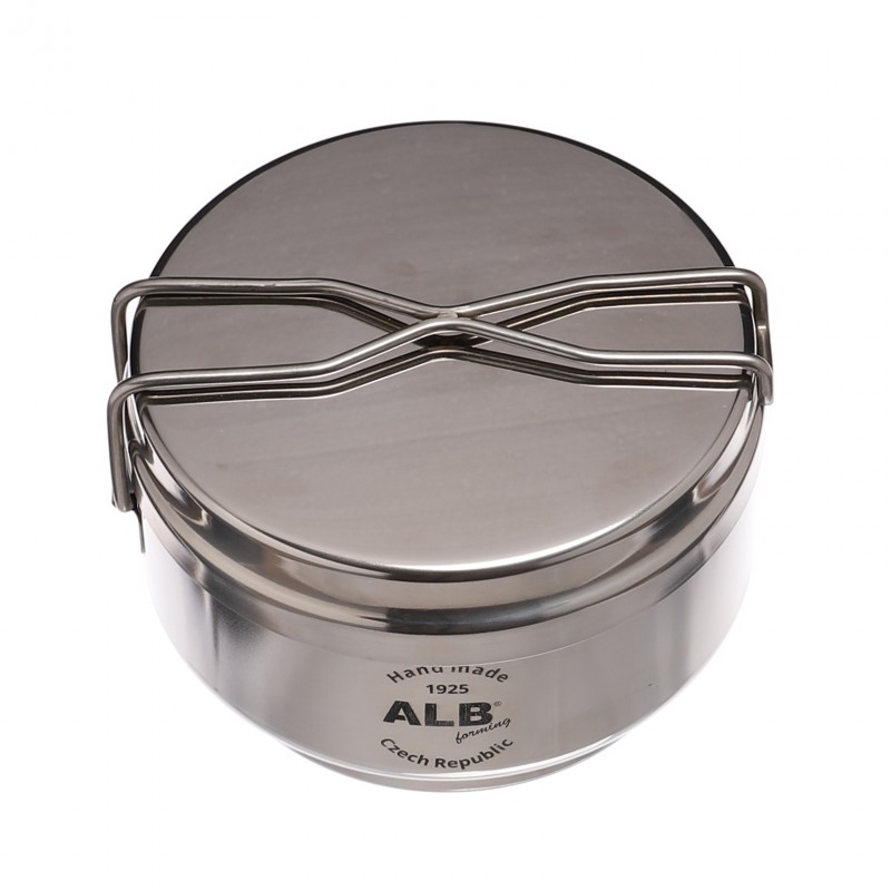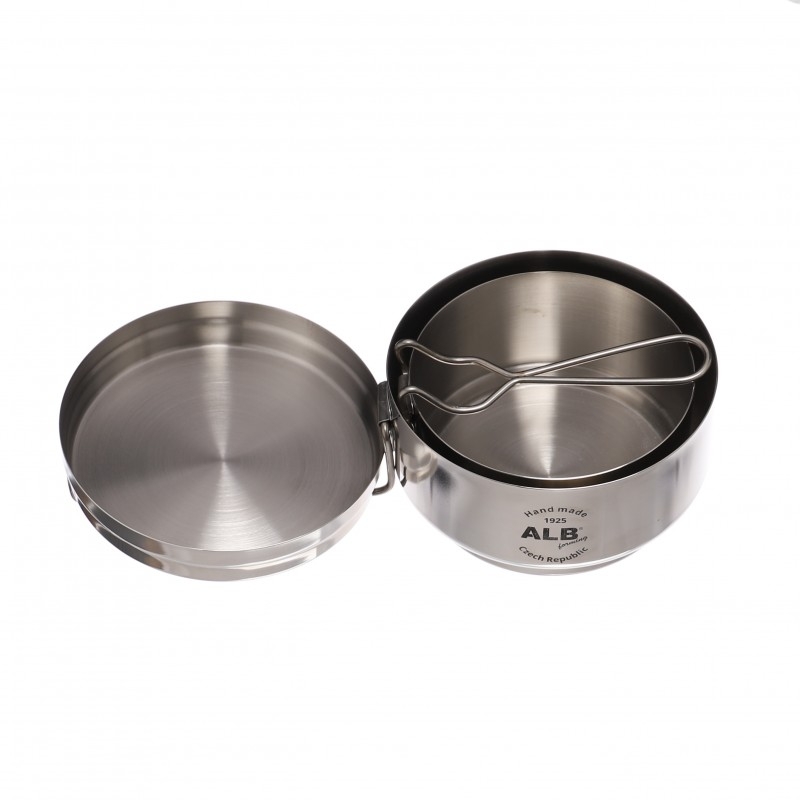 Jídelní sada třídílná se skládá z velké a malé misky, které jsou opatřeny drátěnými držadly a víčka. Nádobí je určeno pro přípravu pokrmů za tepla i za studena (případně ohřev tekutin apod.). Je vhodné pro kempink, vybavení armád aj. Sada je vyrobena z korozivzdorné oceli CrNi 18/10 (1.4304), tloušťka materiálu je 0,8 mm. Drátěné držadlo je vyrobeno z nerezového drátu tl. 4 mm (1.4016) Povrchová úprava všech částí výrobku je vně leštěný uvnitř jemně broušený povrch.