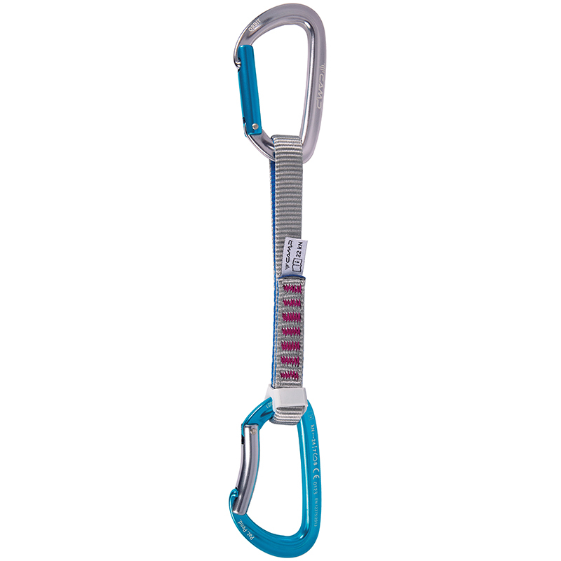 Prodloužená dámská expreska s kombinací plných karabin CAMP Orbit a 16 mm nylonovou smycí v délce 18 cm.