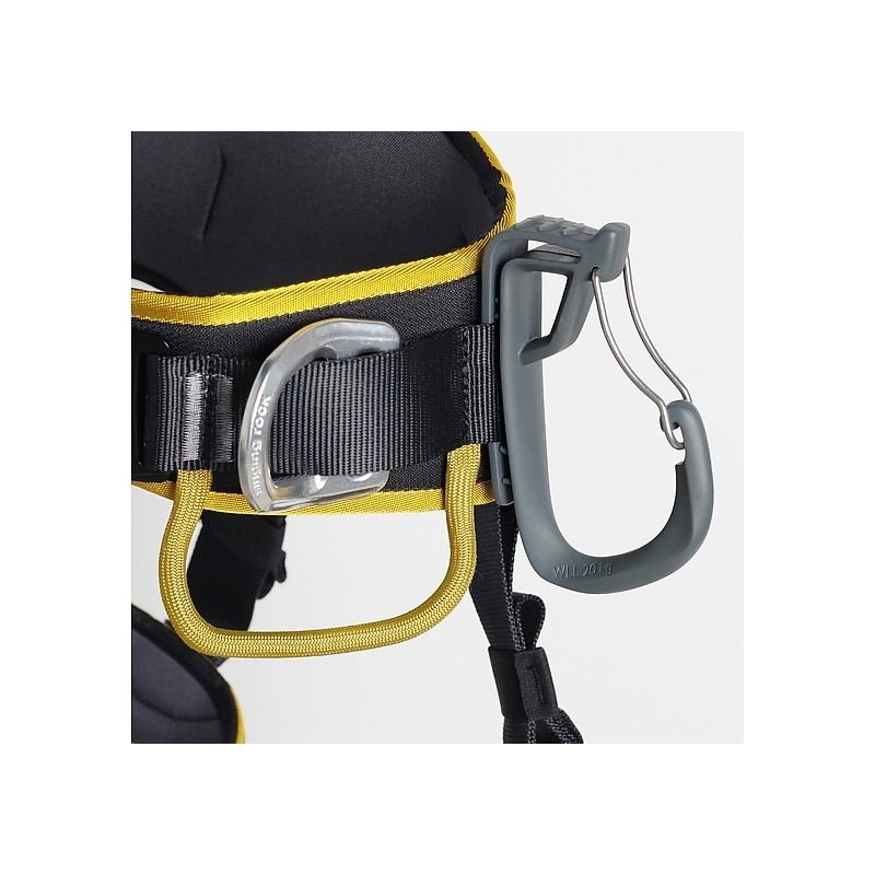 Patentovaný systém uchycení PRESS CLICK umožňuje rychlou montáž/demontáž na postroji. Funkce EASY WIRE, ponechání zámku nosiče v otevřené poloze, ti jednoduše dovolí odebrat a připnout vybavení jednou rukou. Horní hrana je uzpůsobená pro odkládání a organizaci nářadí. Světlost 40 mm umožnuje zavěšení např. motorové pily přímo za rukojeť. Maximální zatížení 20 kg s bezpečnostním koeficientem 5 dovoluje nošení těžkých břemen. Minimální pevnost do přetrhu je 100 kg.