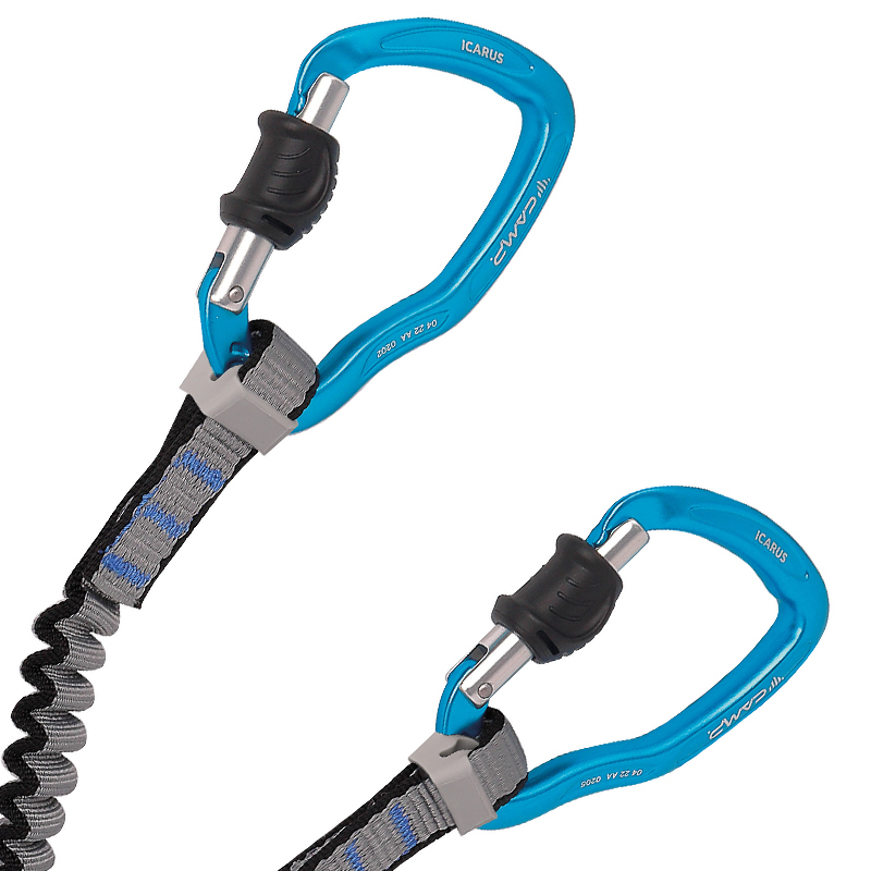 Set je opatřen lehkými karabinami CAMP Icarus a elastickými 19mm lanyardy, které díky smršťování nikde nepřekáží.