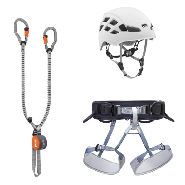 Sada obsahuje vše, co potřebujete pro bezpečný pohyb po zajištěných cestách – ferratový tlumič pádu, sedací úvazek a horolezeckou přilbu.