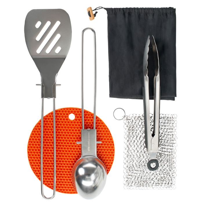 Příslušenství pro grilování a vaření jídla od značky GSI vám umožní připravit jídlo i v přírodě jako ve špičkové restauraci. Celá sada je vyrobená z prvotřídní nerezové oceli. Vše se snadno čistí a součástí balení je také transportní obal. Sadu doporučujeme doplnit některým z kvalitních zavíracích nožů, se kterým připravíte suroviny na gril rychle a bezpečně. Sada obsahuje kleště s možností aretace, obracečku se skládací rukojetí, servírovací lžíci, nerezovou drátěnku a silikonovou podložku/chňapku.