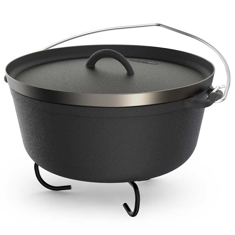 Guidecast Dutch Oven nabízí výborný rozvod tepla a navíc je o 30% lehčí než konvenční litiny. Nitridovaný povrch trouby zajišťuje stálou odolnost proti korozi. Mezi další výhody patří leštěné dno, které umožňuje vaření na sporáku, ohni, v troubě i na indukční desce. Dále pak pohodlné rukojeti pro snadnou manipulaci či zavěšení vašich kuchařských nástrojů. Holandskou troubu je při použití v ohni možné zapustit do žhavých uhlíků nebo jí použít jako zavěšený kotlík nad oheň. Holandskou troubu GSI Outdoors Guidecast Dutch Oven omyjete jednoduše za použití ručního mytí teplou vodou a solí. Před dalším použitím nechte důkladně zaschnout.