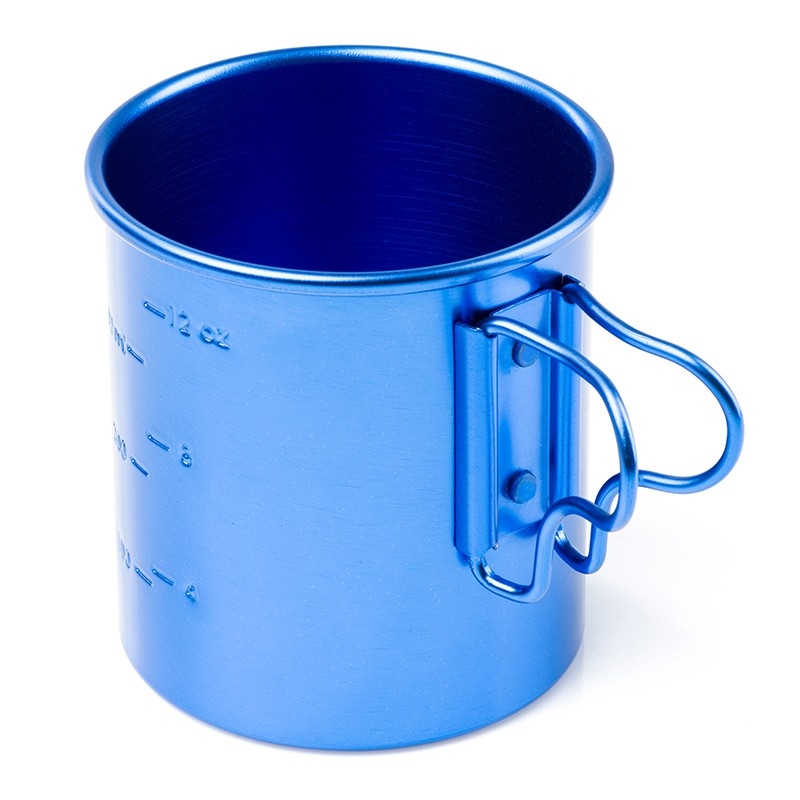 Na hrnku je vyražena i stupnice objemu. Přesto, že je hrnek z eloxovaného hliníku, který je odolný proti oxidaci a velmi odolný i mechanicky, nepatří na volný oheň.