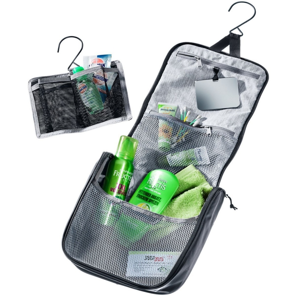 1 síťovaná kapsa na zip, 1 kapsa na zip, hlavní velká kapsa, zrcátko, vyjímatelné pouzdro s vlastním háčkem, háček na zavěšení tašky, elastické smyčky na kartáčky a jiné potřeby.