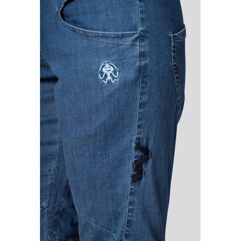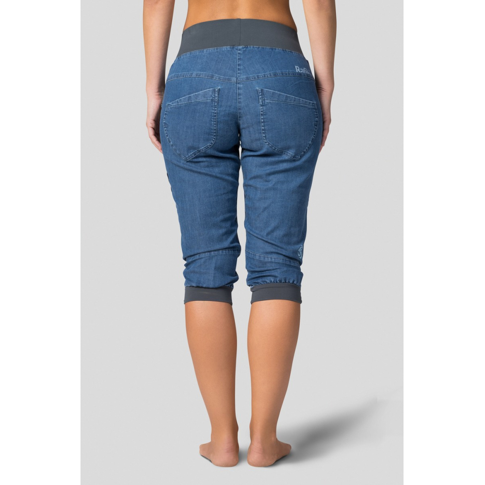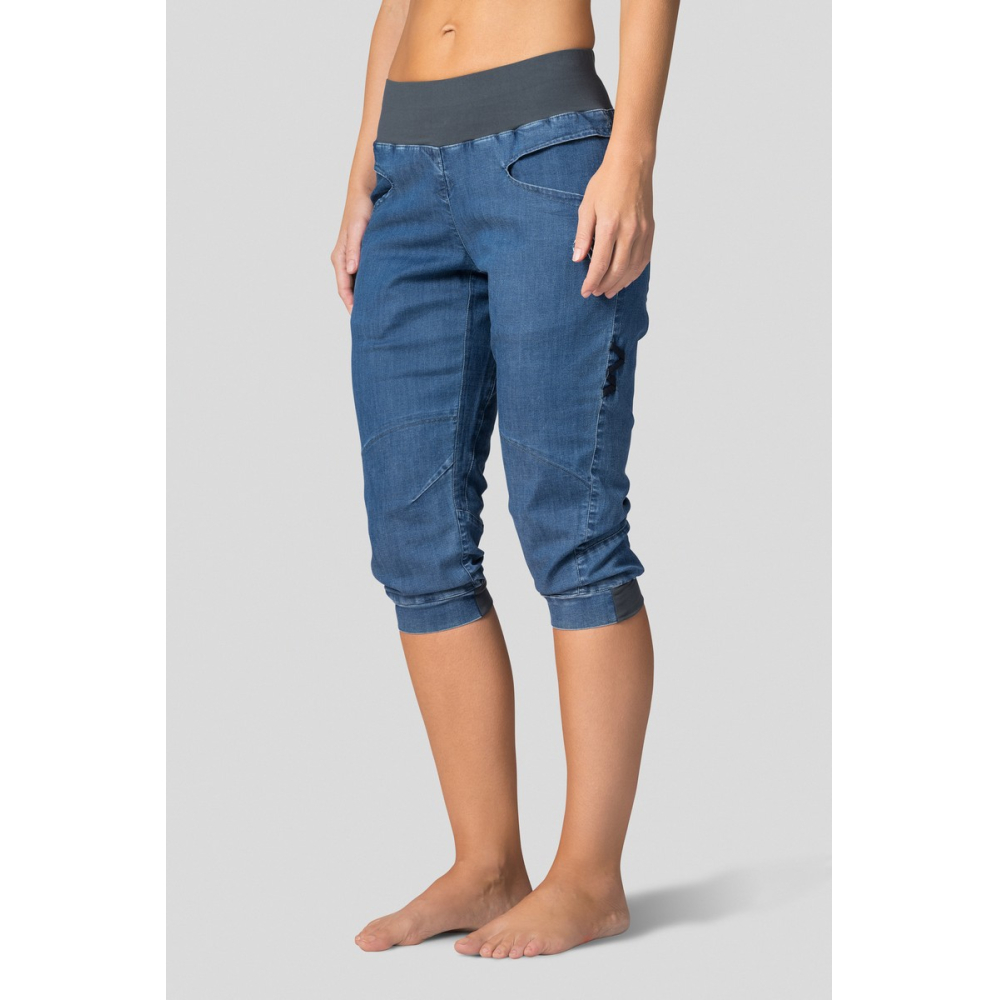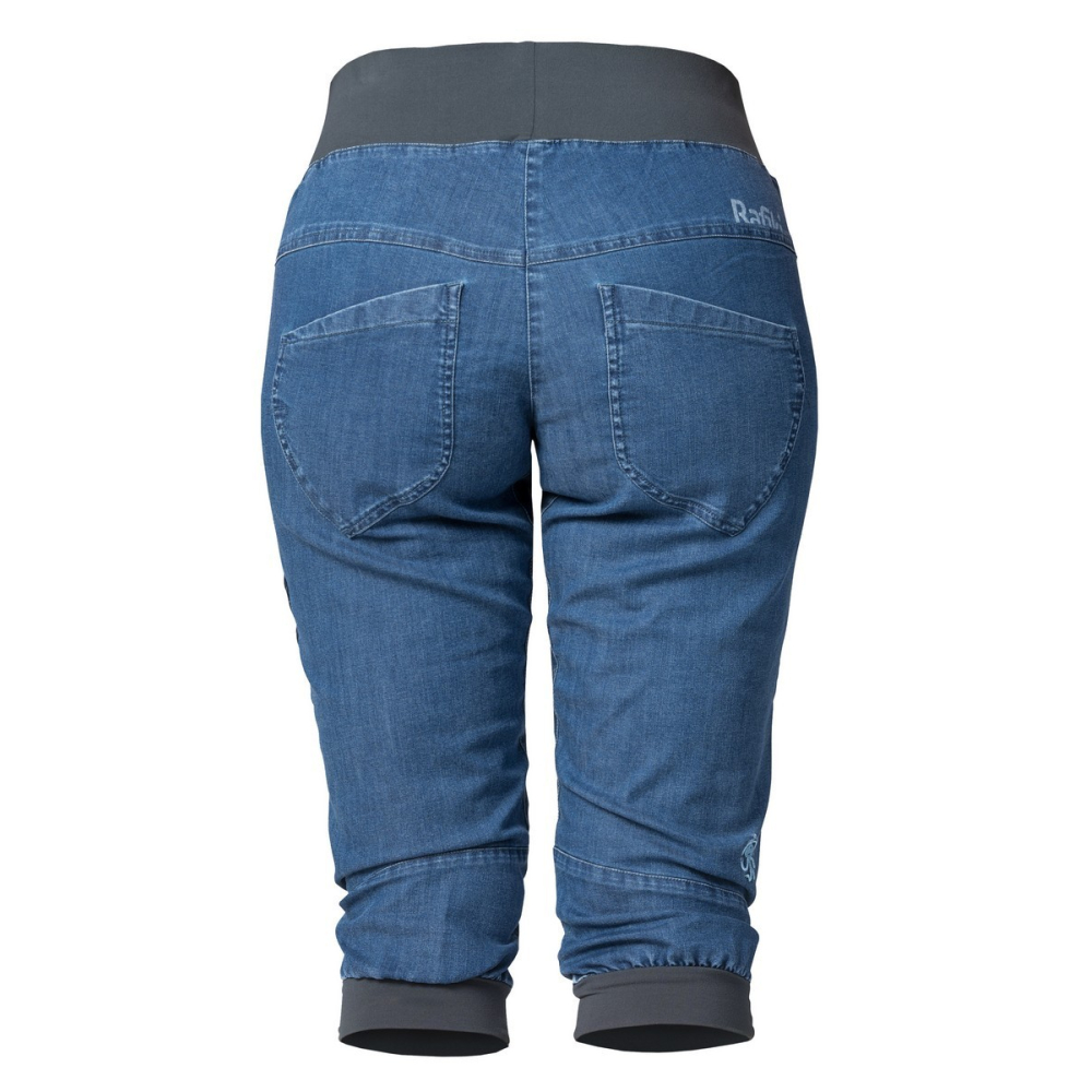 Dámské lezecké tříčtvrťáky Chain Capri se dají nosit jak do města, tak i na skálu a boulder. Jsou vyrobené z ultralehké, prodyšné, pružné a rychleschnoucí džínoviny. Díky širší manžetě v pase kalhoty dobře padnou a vsazený klín umožňuje pohyb bez omezení. Se zdvojenými tvarovanými koleny není problém opřít se o drsnou skálu. Manžeta na nohavicích je vzadu stažená do gumy. Zajímavým detailem je i ozdobné poutko na kartáček.