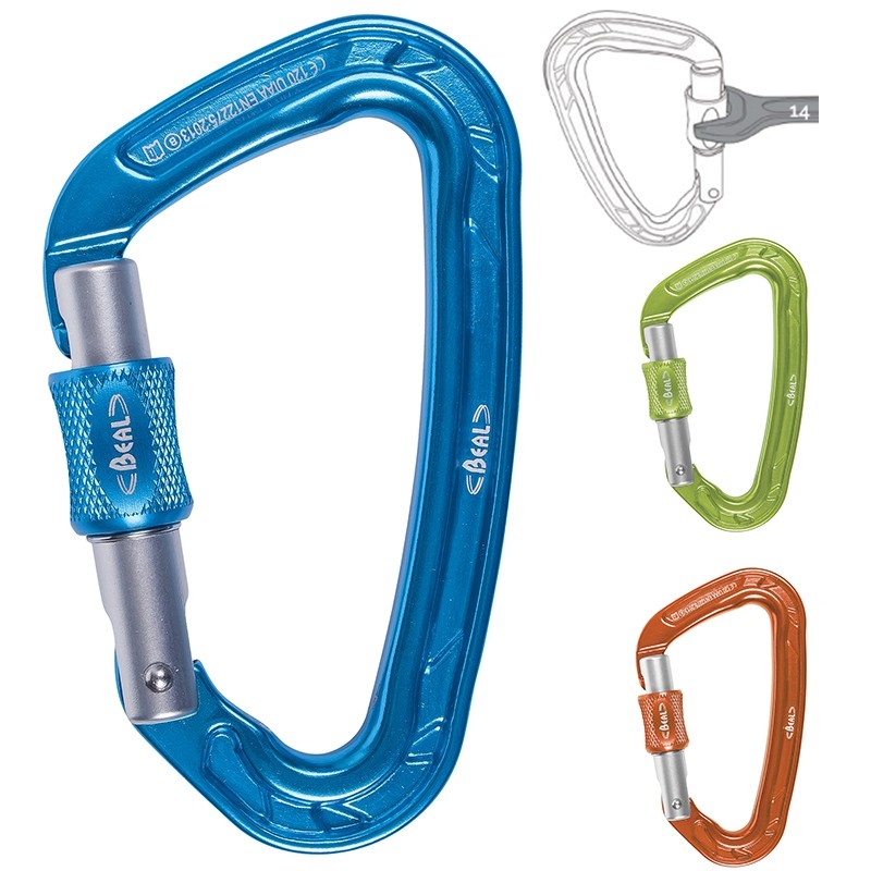 Asymetrická "D" keylocková karabina se šroubovacím zámkem, upraveným pro pevné dotažení klíčem (14). Karabina Be Quick je vhodná pro zajištění ve štandu.