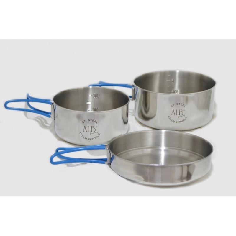 Nerezová sada s uvnitř broušeným a vně leštěným povrchem. Určena pro rychlé mytí, vhodná pro rodinné vaření a delší pobyt v přírodě. Opatřena textilním obalem.