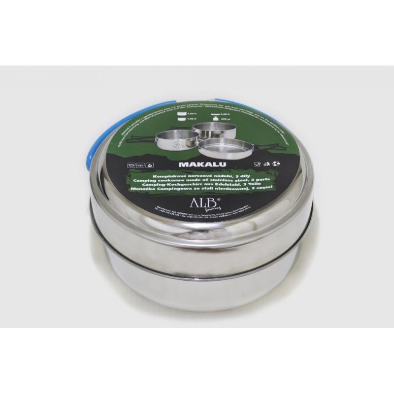 Nerezová sada Makalu je velice populární produkt již od počátku její výroby. Sada je vyrobena z kvalitního nerezu (CrNi 18/10). Pánev i misky mají lemovku a jsou opatřeny sklopnými držadly se silikonovou ochranou. Sada je opatřena prolisem na dně velké misky pro větší stabilitu na vařiči. Do sady se dá snadno zabalit například i plynová kartuše. Každá miska má rysku. Každá sada obsahuje i obal.