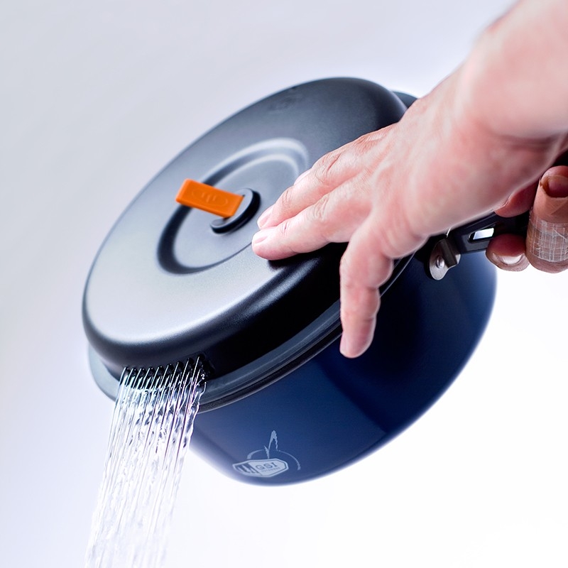 Do této sady lze umístit také plynový vařič. Perforovaná poklička z BPA-free plastu umožnuje bezproblémový únik par z hrnce a zároveň slouží jako sítko například pro slití vody z těstovin. Jednotlivé nádoby jsou barevně odlišené pro snažší orientaci.