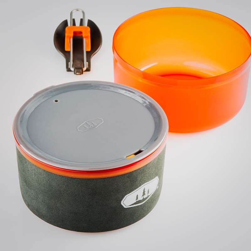 Nízkoprofilová konvička s hrnkem a mističkou pro jednu osobu z nejlehčí řady Halulite - tvrdě anodizovaný (eloxovaný) hliník. Do sady lze umístit také plynovou kartuši 110g (není součástí balení). Nízká konvička s objemem 1l a širokým hrdlem umožňuje kromě vaření také pohodlný přístup např. na rozpouštění sněhu. Unikátní hrnek a miska s nízkým těžištěm zabraňuje vylití. Víčko u hrnečku lze použít jako pítko. Tento hrnek je po obvodu opatřen neoprénovým obalem. Dobře viditelná vnitřní stupnice objemu uvnitř konvice. Set obsahuje: 1l konvičku se širokým hrdlem, 400ml hrneček s neoprénovým termoobalem a víčkem s pítkem, 400 ml mističku, skládací vidličko-lžíci GSI Folding Foon, pokličku a síťovaný obal.