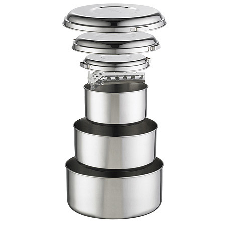 Alpine 4 souprava je vyrobena z neuvěřitelně odolné nerezové oceli, spolehlivé i v těch nejextrémnějších podmínkách. Je ideální pro náročné a časté používání. Každá nádoba má vlastní víko, které zároveň slouží jako talíř. Celou sadu lze složit do největšího hrnce.