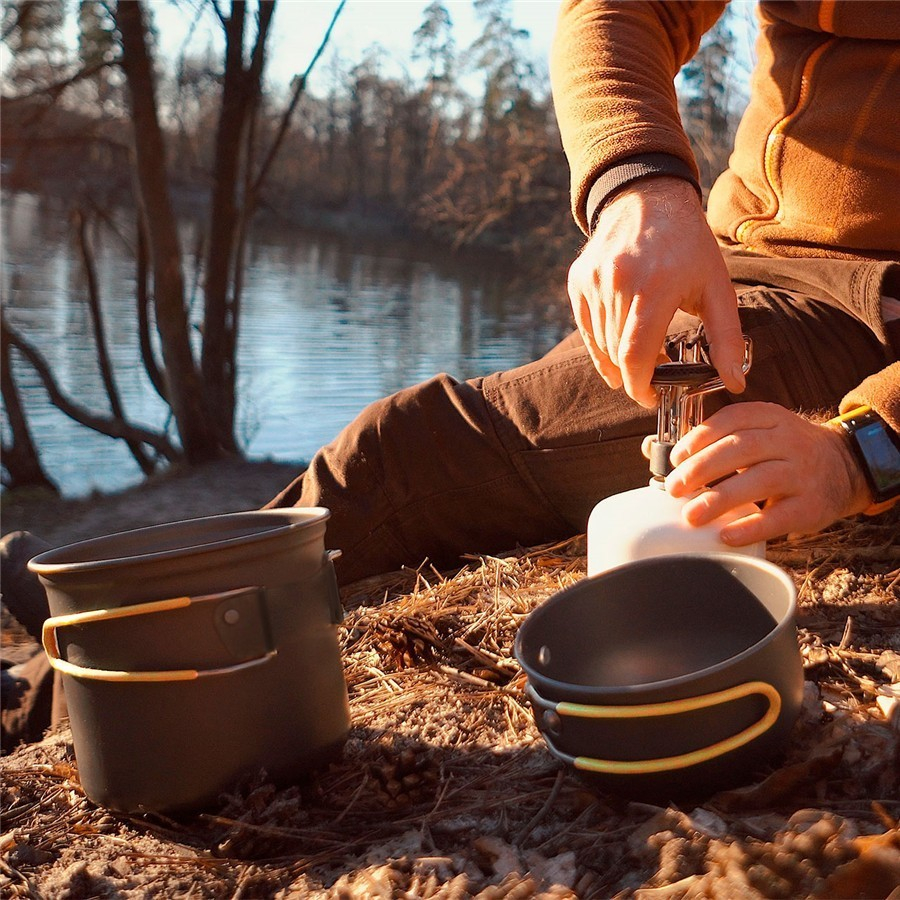 Sada nádobí pro 2-3 osoby z eloxovaného potravinářského hliníku je opatřena vrstvou odolnou proti oděru. Držadla jsou chráněna silikonem proti popálení a jsou příjemná do ruky. Dodáváno včetně přepravního obalu. Velmi lehká a kompaktní. Do hrnce se pohodlně vejde kartuš na plyn (do malého hrnce 300 g, do velkého 300 i 500g) a vařič. Obsah sady: 1x hrnec - 1,5 l (15x11 cm). 1x miska - 0,75 l (13,7x6,5 cm). 1x hrnec - 1,0 l (12x10 cm). 1x miska - 0,5 l (12x6 cm) a 1x houbička.