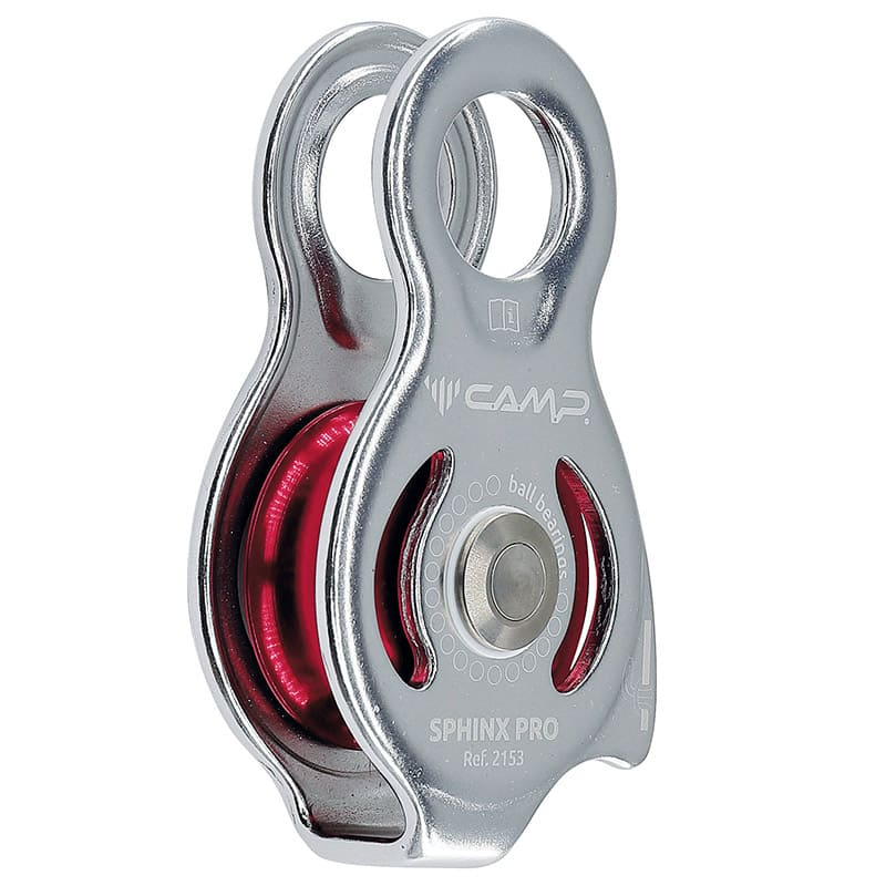 CAMP Sphinx PRO je odolná a multifunkční jednoduchá kladka vybavená vysoce účinným kuličkovým ložiskem a pevností 25 kN. Disponuje pevnými bočnicemi s velkým kotvícím otvorem, kterým lze snadno protočit karabinu i se zámkem. Praktický výstupek na jedné straně navíc umožňuje použití pomocného prusíku.