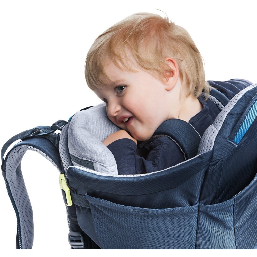 Důmyslný nový síťový systém opěradla Aircomfort Sensic Vario ještě více zpříjemňuje rodinám horská dobrodružství: zátěž se přenáší perfektně, dětský nosič sedí pohodlně, zatímco záda jsou plně odvětrávána. Dítěti je poskytnuto velké pohodlí: Velký měkký polštář jemně vzpírá hlavu unaveného dítěte i v rozích a podporuje relaxační spánek. Boční přístup a snadno přístupný systém pásů dětského rámu zajišťují bezpečnost - zaručeno bezpečnostní značkou TÜV GS.