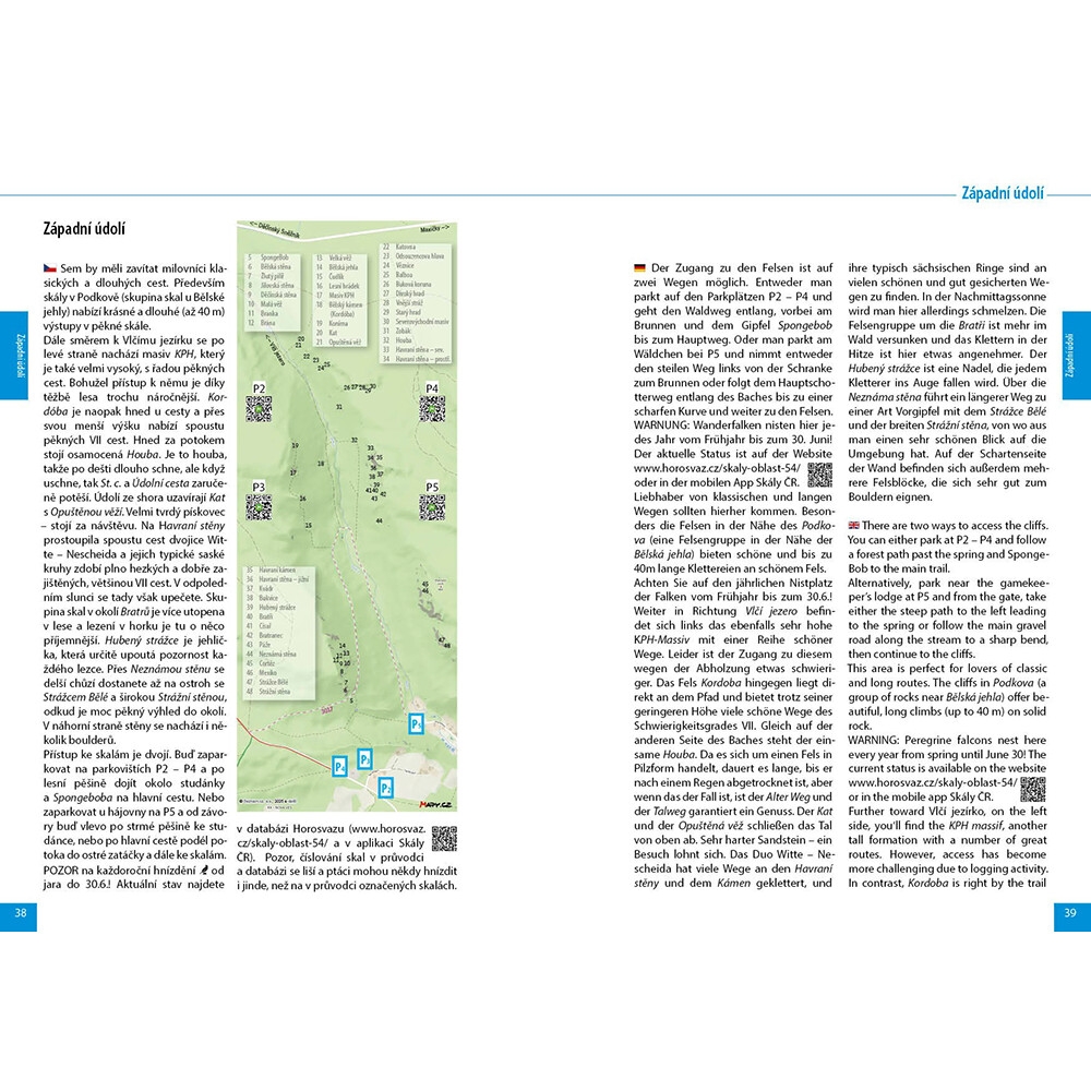 Oblast je rozdělena do pěti podsektorů. U každého naleznete přehledné informace o typu skal, charakteru lezení a možnostech parkování. Každá skála je doplněna o fotografii s vyznačenými cestami.