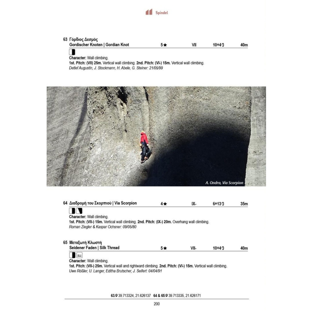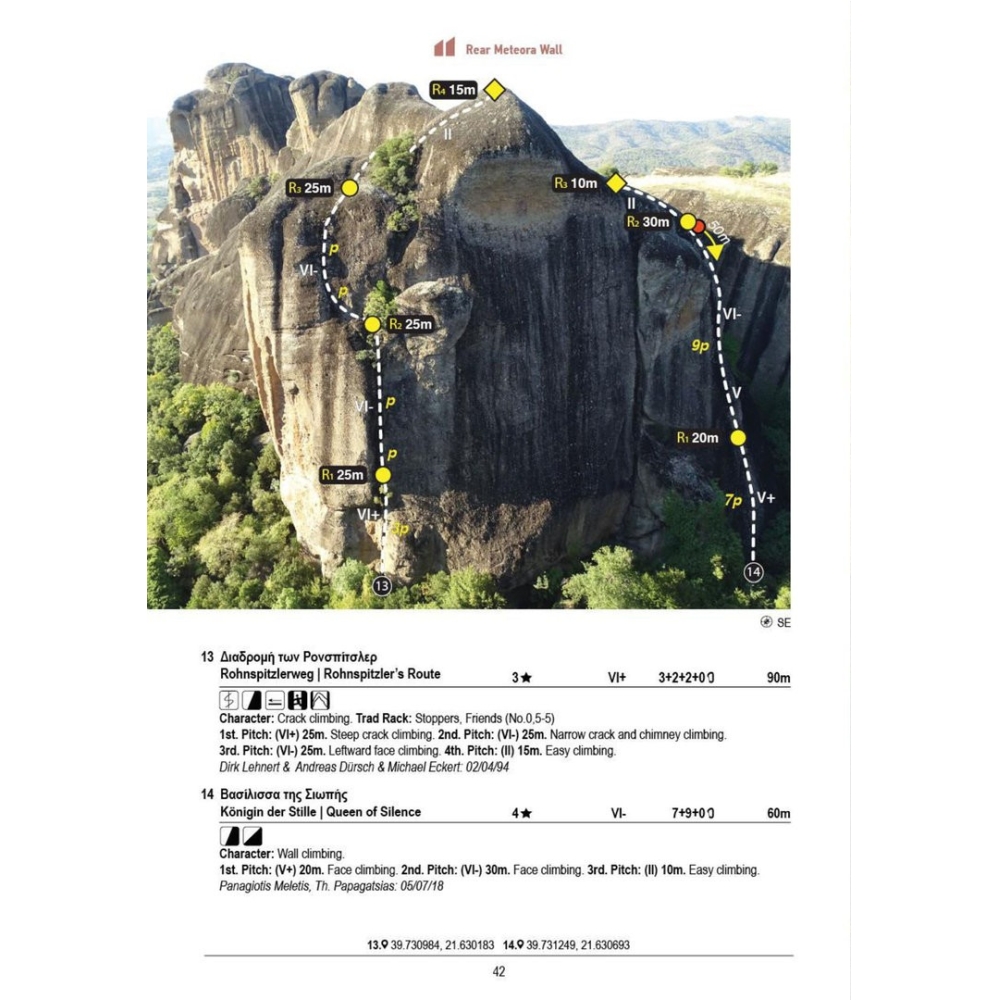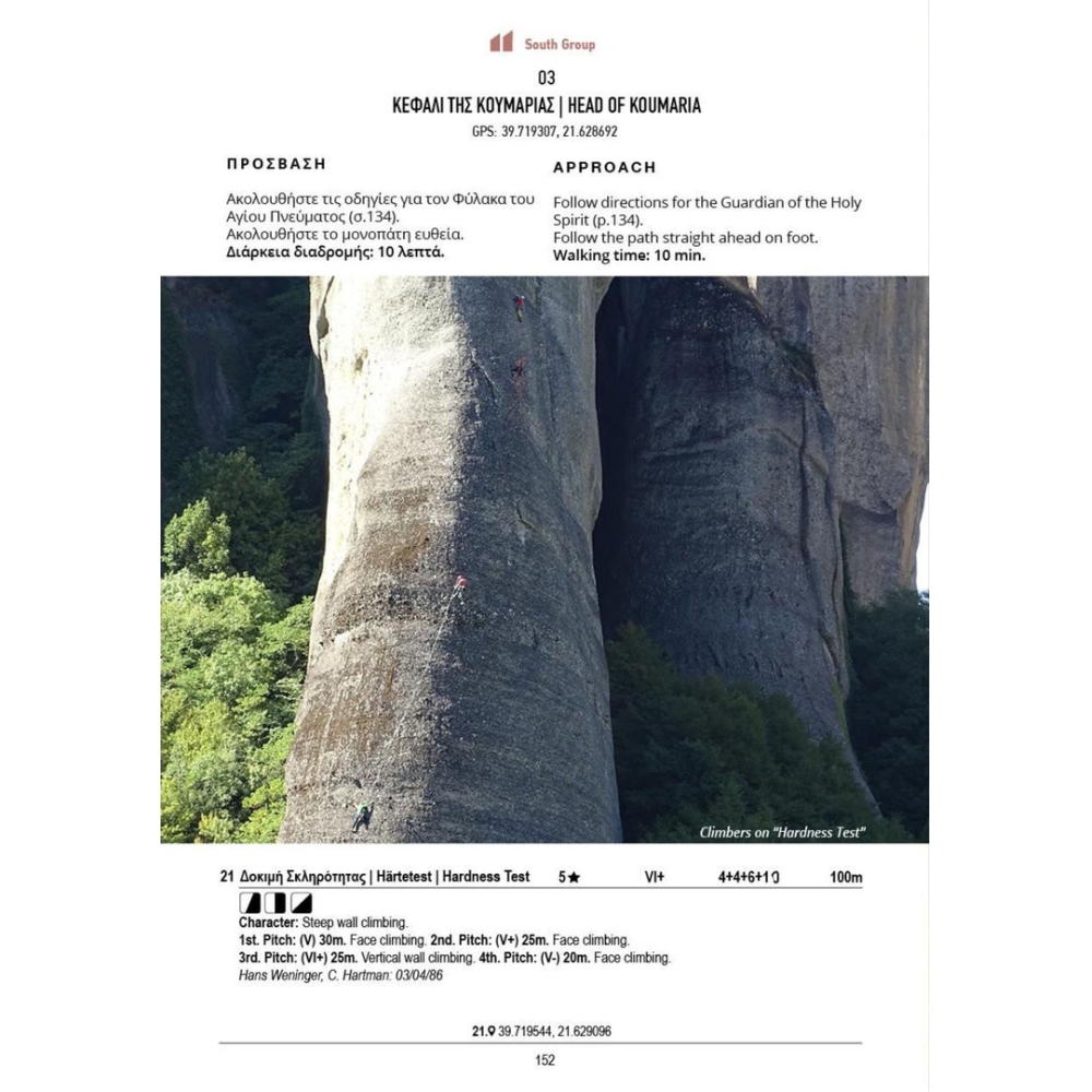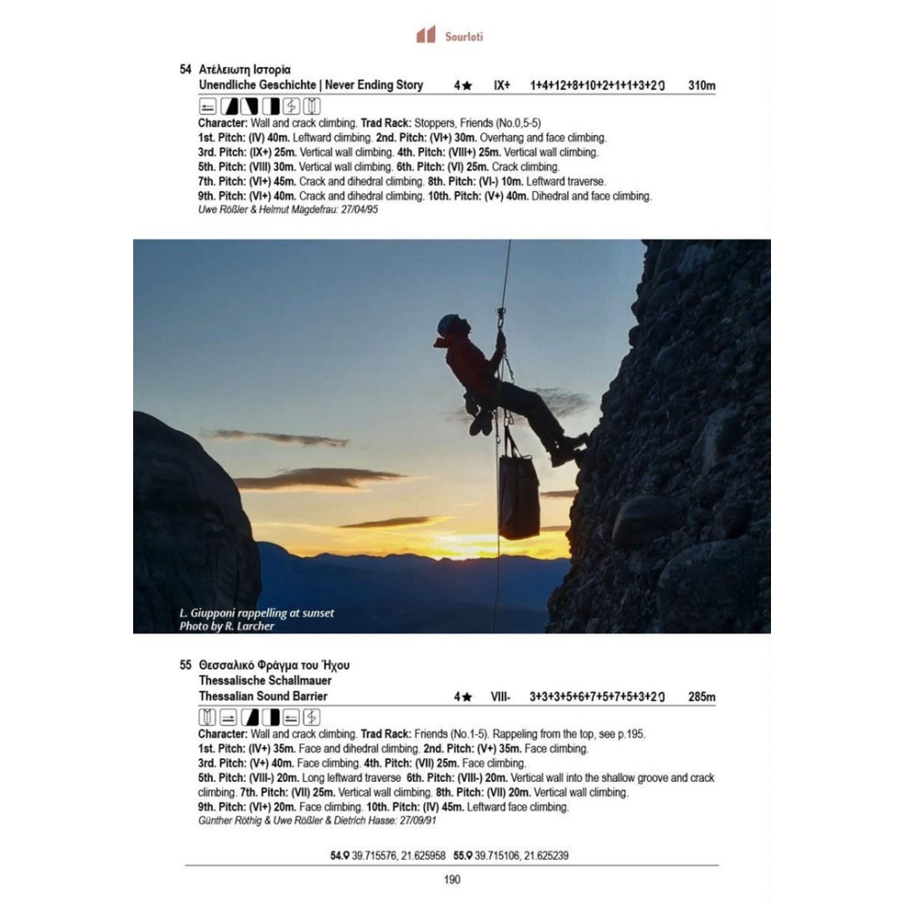Tento průvodce popisuje tradiční i moderní skalní lezení na Meteoře s klasickými i moderními cestami na 46 ze 171 věží Meteory a 206 vícedélkových cest z celkového počtu 860.