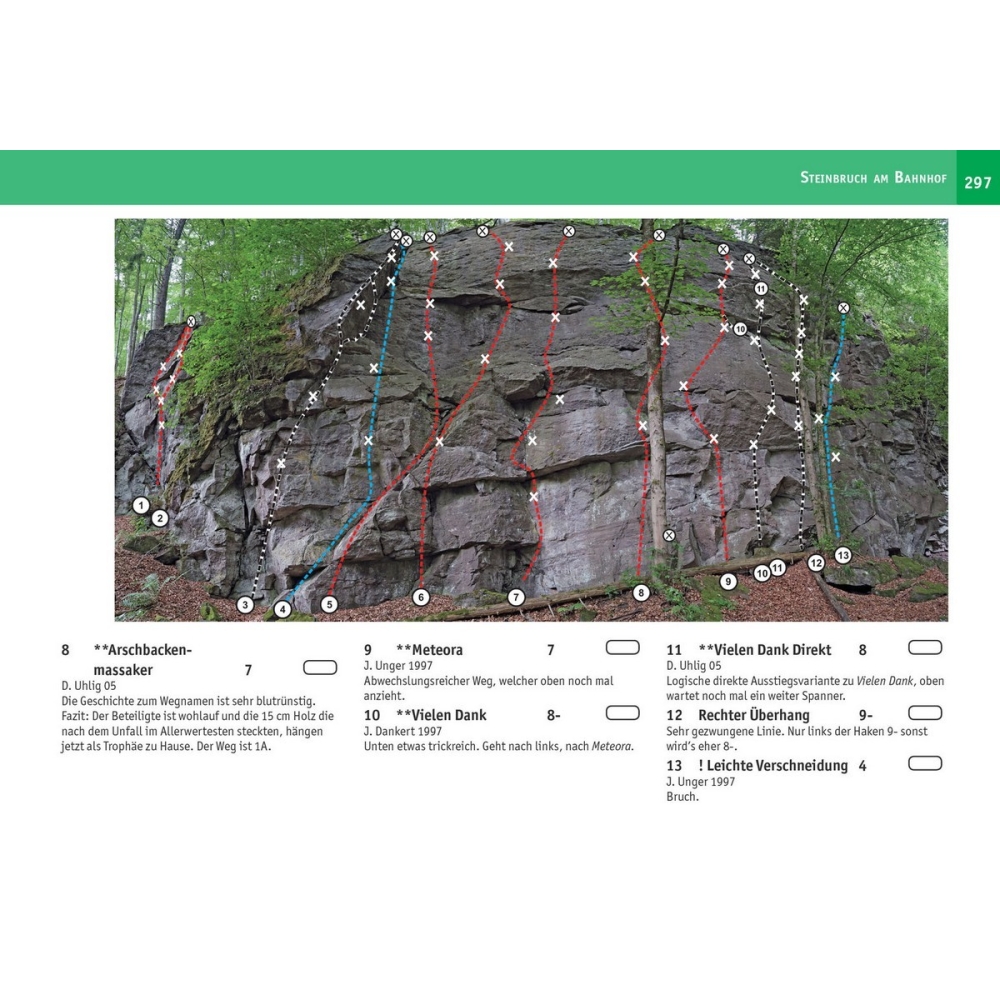 Ať už porfyr, vápenec, břidlice nebo pískovec – vše je pro horolezce v zemi kamenů k dispozici. Nová edice zapůsobí přesnými fotografickými toposy, znázorněním zcela nových lezeckých míst, dalšími podrobnými mapami a velmi přesným přístupem a popisem přístupu slovně, v obrázcích a mapách.