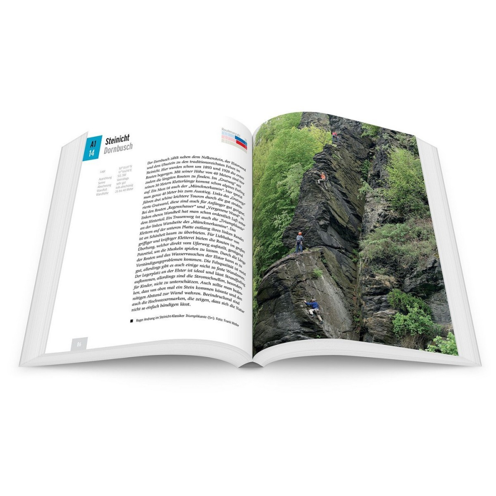 Místní znalec a autor průvodce Andreas Schuster působivě ukazuje, že v tomto historicky důležitém a velmi malebném regionu ve čtyřčlenném koutě mezi Bavorskem, Durynskem, Saskem a Českou republikou je lezení vynikající. Nové vydání bylo kompletně přepracováno a nyní zahrnuje více než 1000 cest v obtížnostech 3 až 9.