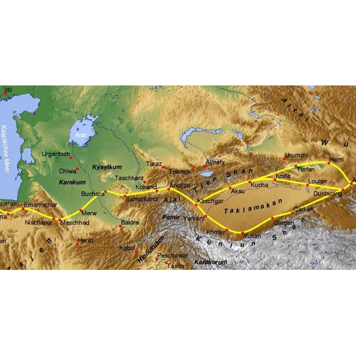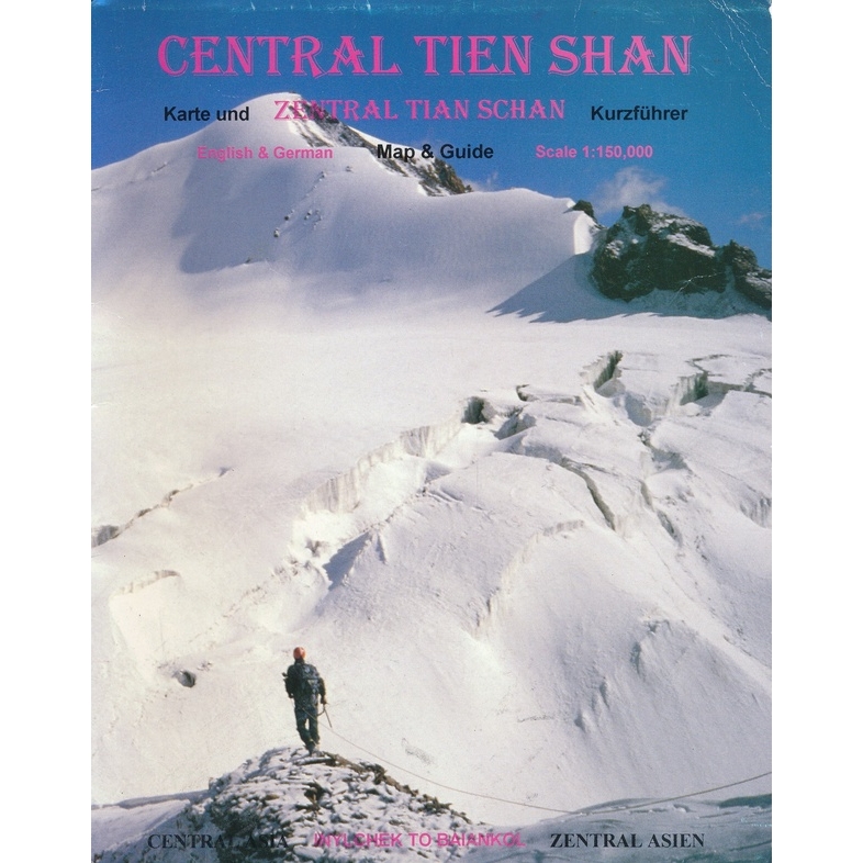 Přehledná mapa regionu Tien Shan v poušti Taklamakan v pohraničí Kazachstánu, Kyrgyzstánu a západní Číně. Mapa se stručnými informacemi o přístupu, vízech, klimatu a počasí, flóře a fauně, horolezectví, ledovcích a geomorfologii. V angličtině a němčině Tian Shan leží na severu a západě pouště Taklamakan v pohraničí Kazachstánu, Kyrgyzstánu a Ujgurské autonomní oblasti Xinjiang v západní Číně. Na jihu se spojuje s pohořími Pamir. Rozšiřuje se také do čínské provincie Xinjiang a do severních oblastí Pákistánu, kde se napojuje Hindúkuš.