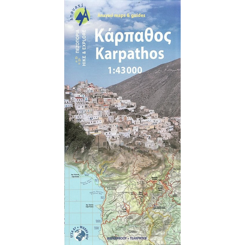 Karpathos, hornatý ostrov s členitým terénem a nádhernou krajinou, je jedním z nejautentičtějších míst v Řecku. Na jihu má nekonečné písečné pláže a na severu odlehlé zátoky se smaragdově modrou vodou. Rozvinutější jih ostrova je oblíbený surfaři, zatímco sever stále udržuje lidové cesty naživu, zejména v kouzelné vesnici Olymbos, posazené na sedle mezi dvěma horami a dvěma moři. U severního cípu Karpathosu, odděleného od něj úzkým kanálem, je neobydlený ostrov Saria se starými zemědělskými osadami a zbytky středověkých domů v Palatii. Tato nová podrobná mapa Anavasi navrhuje 12 turistických stezek na severu a 6 na jihu a představuje hlavní body ostrova.