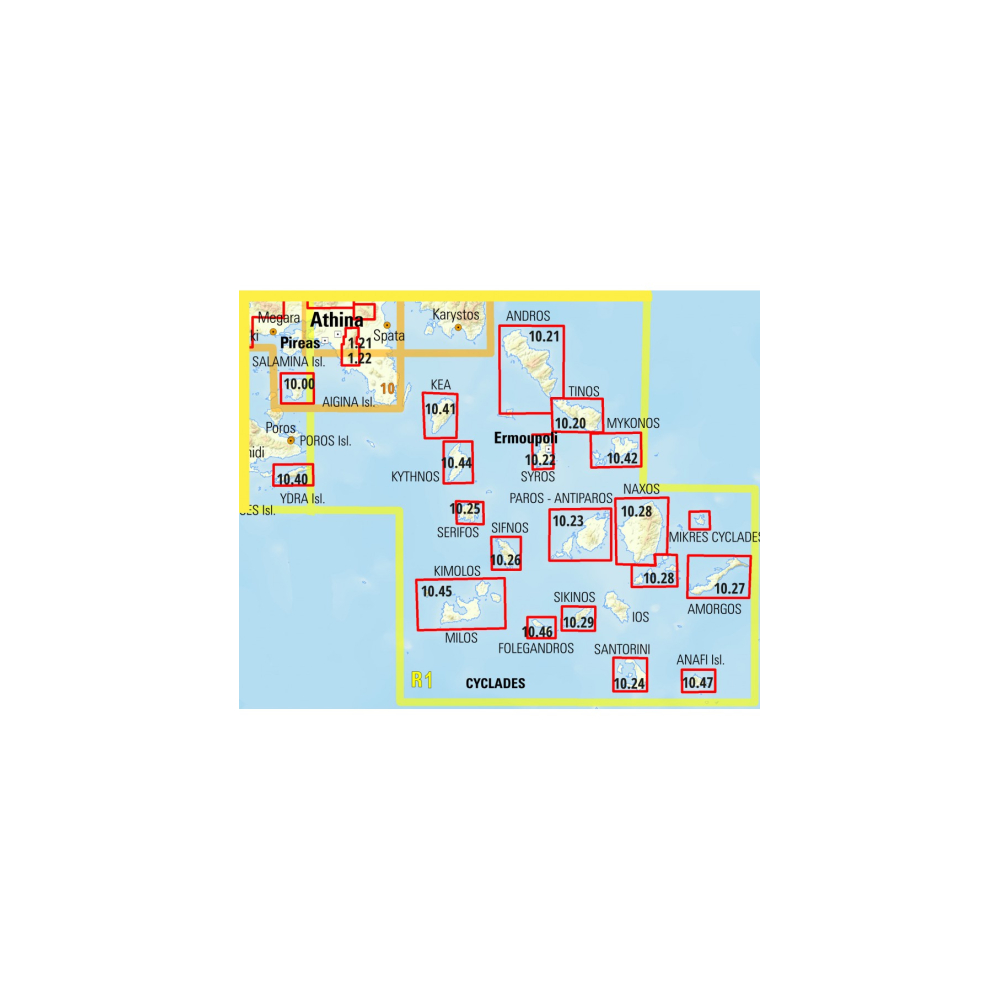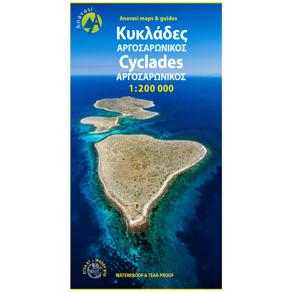 The Cyklades & Mapa Argosaronic pokrývá oblasti Atiky s argosaronskými ostrovy Salamina, Aegina, Hydra a Poros a také všechny Kykladské ostrovy, vytištěné na 2 stranách s přesahem.