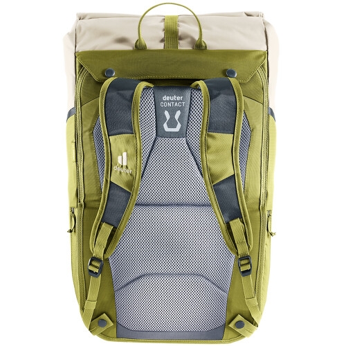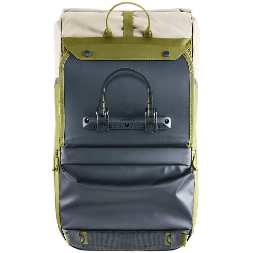 Patentky fixují panel v horní nebo dolní poloze a odhalují buď rychloupínací systém BagFix (pro připevnění k nosiči kol) nebo zádový systém Contact s ergonomickými ramenními, odventilovanými popruhy.