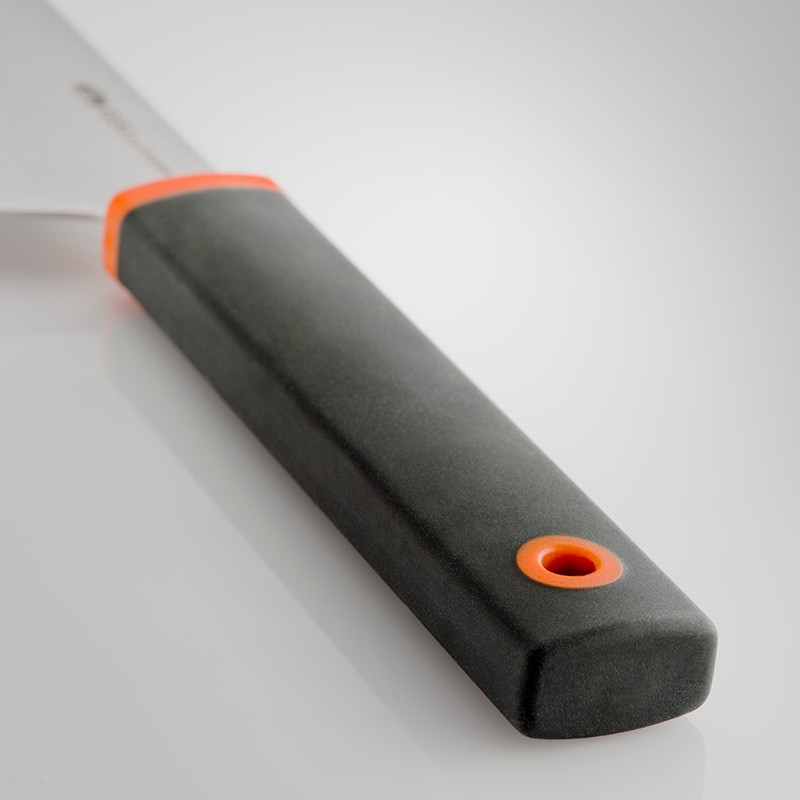 Je vyroben z nerezové oceli a rukojěť je z maximálně příjemného měkčeného materiálu pro komfortní a bezpečné uchopení. Nůž má na konci rukojeti otvor pro zavěšení.