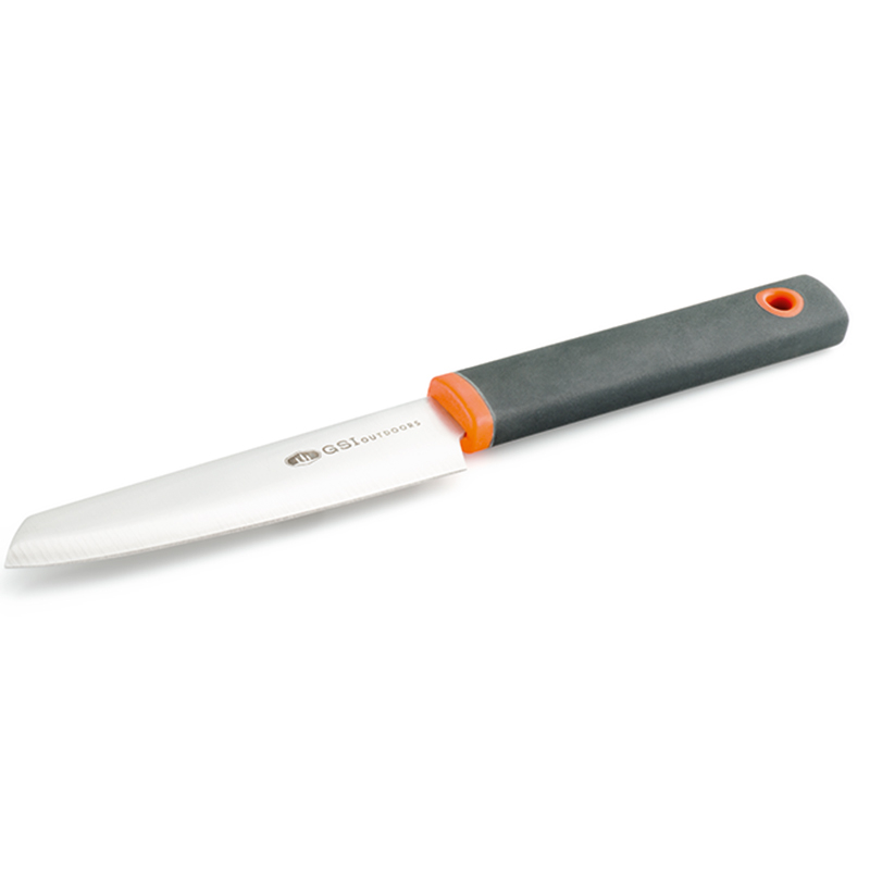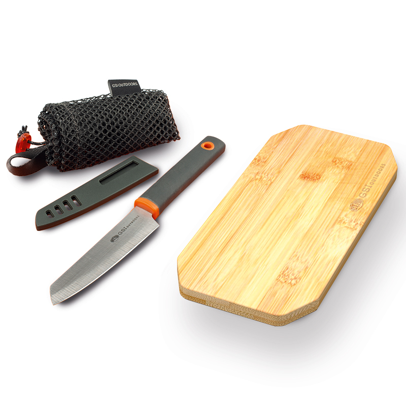 Santoku Prep Set od GSI Outdoors je praktická kuchyňská sada ideální pro kempování, turistiku nebo pikniky. Obsahuje kvalitní Santoku nůž z nerezové oceli, bambusové prkénko a praktickou stahovací síťku pro snadný transport. Nůž je vybaven ergonomickou měkčenou rukojetí pro bezpečné a pohodlné držení a má otvor na zavěšení.