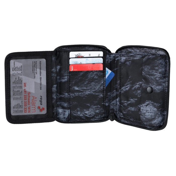 7 přihrádek na karty s fleecem proti poškrábaní. Přihrádka na bankovky. Kapsa na mince. Nepromokavý materiál. Nepromokavý zip. Síťovaná kapsa.